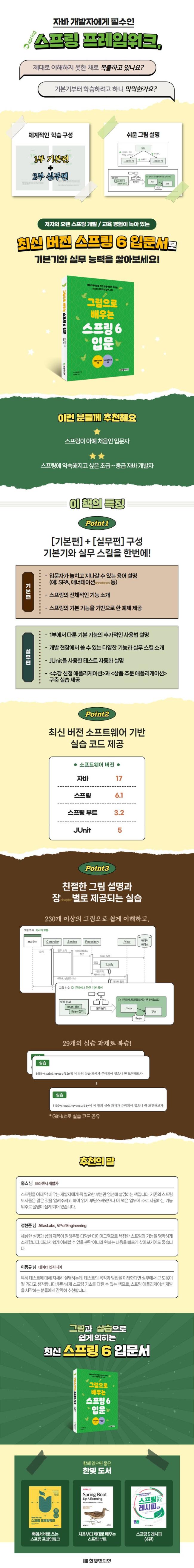 ½ºÇÁ¸µÀº ÀÚ¹Ù¸¦ ¹è¿ï ¶§ º¸Áö ¸øÇß´ø »õ·Î¿î °³³ä, ÀÌÇØÇϱ⠾î·Á¿î ¿ë¾î°¡ ¸¹¾Æ ÀÔ¹®ÀÚ°¡ ¹è¿ì±â ¾î·Æ´Ù. ÇÏÁö¸¸ ÀÌ Ã¥Àº ¡º½ºÇÁ¸µ3 ÀÔ¹®¡»°ú ¡º½ºÇÁ¸µ4 ÀÔ¹®¡»À» ÁýÇÊÇÑ ½ºÇÁ¸µ Àü¹®°¡ÀÎ ÀúÀÚ°¡ ¿À·£ ½ºÇÁ¸µ ±³À° °æÇèÀ» Åä´ë·Î ±¸»óÇÑ ±×¸²°ú ¼³¸íÀ¸·Î ±¸¼ºµÇ¾î Àֱ⠶§¹®¿¡ ´©±¸³ª ½±°Ô ÀÌÇØÇÒ ¼ö ÀÖ´Ù. Å©°Ô [±âº»Æí]°ú [½Ç¹«Æí]À¸·Î ±¸ºÐµÇ´Âµ¥, [±âº»Æí]¿¡¼´Â ½ºÇÁ¸µ 6ÀÇ Àü¹ÝÀûÀÎ ±â´É°ú ¿ø¸®, ½Ç¹«Æí¿¡¼´Â ½ÇÁ¦ °³¹ß ÇöÀå¿¡¼ À¯¿ëÇÑ °¢Á¾ ½ºÅ³À» ¹è¿ï ¼ö ÀÖ´Ù. µû¶ó¼ ÀÌÁ¦ ¸· ÀÚ¹Ù¸¦ ¾Ë°Ô µÈ ½ºÇÁ¸µ ÀÔ¹®ÀÚ¿¡°Ôµµ À¯¿ëÇÏÁö¸¸, ±×µ¿¾È ½ºÇÁ¸µÀ» Á¦´ë·Î ÀÌÇØÇÏÁö ¸øÇÑ Ã¤·Î »ç¿ëÇß´ø ÀÚ¹Ù °³¹ßÀÚ¿¡°Ôµµ ÄÚµå ÇÑ ÁÙ ÇÑ ÁÙÀÌ ¾î¶»°Ô ÀÛµ¿ÇÏ´ÂÁö È®½ÇÈ÷ ¹è¿ï ¼ö ÀÖ´Â ±âȸ°¡ µÉ °ÍÀÌ´Ù. ÀÚ¹Ù 17, ½ºÇÁ¸µ 6¸¦ ºñ·ÔÇÑ ÃֽйöÀüÀÇ ¼ÒÇÁÆ®¿þ¾î·Î '¼ö° ½Åû ¾ÖÇø®ÄÉÀ̼Ç'°ú '»óǰ ÁÖ¹® ¾ÖÇø®ÄÉÀ̼Ç'À» Á÷Á¢ ¸¸µé¾îº¸¸ç ±âº»±â¿Í ½Ç¹« ½ºÅ³À» ´ÙÁ®º¸ÀÚ!