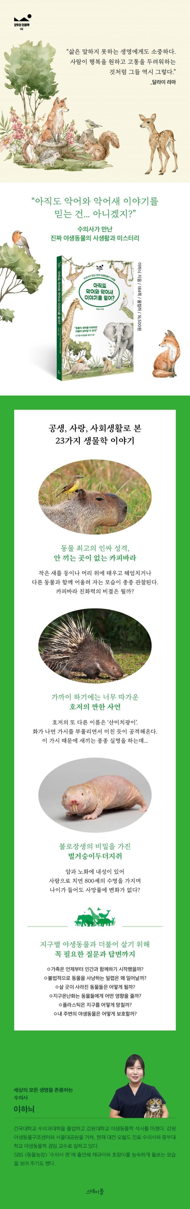 ÀÌó·³ ¾ß»ýµ¿¹°ÀÇ »ýÅ´ Á÷Á¢ È®ÀÎÇÏ±â ¾î·Æ´Ù´Â ÀÌÀ¯·Î Á¦´ë·Î ¾Ë±â°¡ ½±Áö ¾Ê´Ù. ¡¶¾ÆÁ÷µµ ¾Ç¾î¿Í ¾Ç¾î»õ À̾߱⸦ ¹Ï¾î?¡·´Â ¼öÀÇ»çÀÎ ÀúÀÚ°¡ ±×µ¿¾È ´Ù¾çÇÑ ¾ß»ýµ¿¹°µéÀ» º¸È£ÇÏ¸ç °üÂûÇÑ »ý»ýÇϰí Èï¹ÌÁøÁøÇÑ ³»¿ëÀ» ´ãÀº Ã¥ÀÌ´Ù. ±×°¡ ¸¸³ µ¿¹°µéÀº °¢ÀÚ µ¶Æ¯ÇÑ »ýÅÂÀû Ư¼ºÀ» Áö´Ï¸é¼µµ »ç¶÷ó·³ ¼·Î µ½±âµµ Çϰí, ¶Ù¾î³ ¸ð¼º¾Ö¸¦ º¸À̱⵵ Çϸç, »ç¶ûÀ» À§ÇØ ¼±¹° °ø¼¼¸¦ Çϱ⵵ ÇÑ´Ù. ¶ÇÇÑ »ó´ë¸¦ ÀÌ¿ëÇØ À̵æÀ» ÃëÇϱ⵵ Çϰí, ƯÁ¤ÇÑ °³Ã¼¸¦ ±«·ÓÈ÷°Å³ª ºÎºÎ ½Î¿òµµ Çϸç, ÁÖ¾îÁø ¿ªÇÒ ¾È¿¡¼ ¹¬¹¬È÷ »çȸ»ýȰÀ» Çϱ⵵ ÇÑ´Ù.