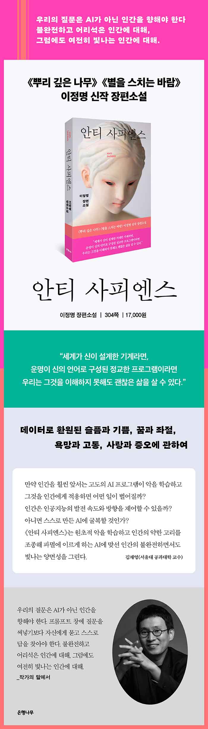 ¡¶»Ñ¸® ±íÀº ³ª¹«¡·¡¶º°À» ½ºÄ¡´Â ¹Ù¶÷¡· ÀÌÁ¤¸íÀÌ ±Ù¹Ì·¡¸¦ ¹è°æÀ¸·Î ´Ù°¡¿Ã AI ½Ã´ë¿¡ µ¥ÀÌÅͷΠȯ¿øµÈ ½½Çİú ±â»Ý, ²Þ°ú ÁÂÀý, ¿å¸Á°ú °íÅë ±×¸®°í »ç¶û°ú Áõ¿À¸¦ ¿ì¸®¿¡°Ô ¼±º¸ÀδÙ. ¿¹Ãø ºÒ°¡´ÉÇϰí ÅëÁ¦¸¦ ¹þ¾î³ AI¿Í ¾î¸®¼®°í ºÒ¿ÏÀûÇÑ Àΰ£ÀÇ ´ë°á. ÀÌÁ¤¸í¸¸ÀÇ ¶Ù¾î³ °¡µ¶¼ºÀ» ´ãº¸ÇÏ´Â ½ÅÀÛ ¡¶¾ÈƼ »çÇÇ¿£½º¡·´Â AI¿Í Àΰ£ÀÇ Ä¡¿ÇÑ ´ë°áÀ» ÅëÇØ Áö±Ýº¸´Ù ´õ Àΰ£ÀûÀÎ °Í, ±×·³¿¡µµ ¿©ÀüÈ÷ ºû³ª´Â Àΰ£¿¡ ´ëÇØ ±íÀº ¼ºÂûÀû ¸Þ½ÃÁö¸¦ ÀÌ ¼Ò¼³À» ÅëÇØ ³»º¸³»°í ÀÖ´Ù.