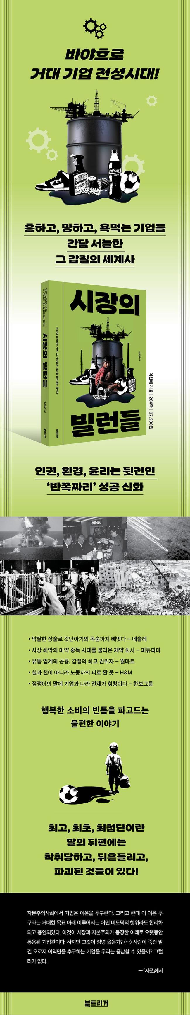 ¡º½ÃÀåÀÇ ºô·±µé¡»Àº ¼¼°è¸¦ ÁÖ¹«¸£´Â °Å´ë ±â¾÷µéÀÌ ÀúÁú·¯ ¿Â ¾ÇÇà, ºÎµµ´öÀÇ ¿ª»ç¸¦ ¼Ò°³Çϴ åÀÌ´Ù. ½ÃÀå¿¡¼ ¡®Çõ½ÅÀÇ ¾ÆÀÌÄÜ¡¯À¸·Î Ãß¾Ó¹Þ´Â ±×µéÀº ºÎÁÖÀÇ¿Í Å¸¸À¸·Î ½É°¢ÇÑ È¯°æ¿À¿°À» ÃÊ·¡ÇÏ°í ¼ö¸¹Àº ¸ñ¼ûÀ» ¾Ñ¾Æ °¬À¸¸ç, ¼º°ú¿Í È¿À²À» ¸Í¸ñÀûÀ¸·Î ÁÀ¾Æ ³ëµ¿ÀÚ¸¦ ºÎǰó·³ °¥¾Æ ³Ö°í, »·»·ÇÑ °©Áú°ú ½ÃÀå ³í¸®¸¦ ¹«½ÃÇÏ´Â ¾î¸®¼®Àº ÆÇ´ÜÀ¸·Î ¿ì½º²Î½º·¯¿ï Á¤µµÀÇ Èæ¿ª»ç¸¦ ³²°å´Ù. ÀÌ Ã¥¿¡¼´Â Èð¾îÁö°í Áö¿öÁ® ¸íÈ®ÇÏ°Ô ÆÄ¾ÇÇϱ⠾î·Á¿î ±× »ç°Ç¡¤»ç°íÀÇ Àü¸»À» ¡¶¹ÎÁßÀǼҸ®¡· ÀÌ¿Ï¹è ±âÀÚ°¡ °æÄèÇÏ°íµµ Èû ÀÖ´Â ¾îÁ¶·Î µé·ÁÁØ´Ù.