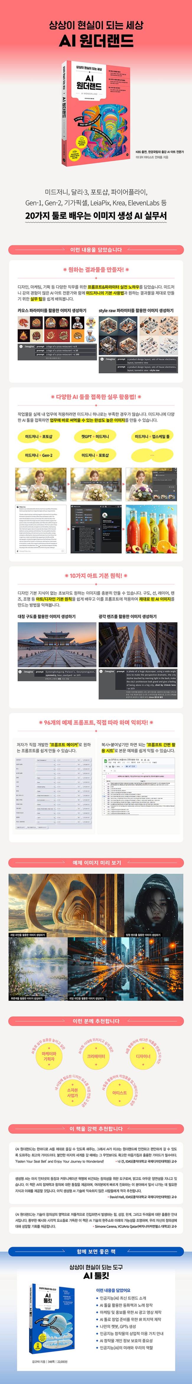 ù ¹øÂ° ÆÄÆ®¿¡¼´Â »ý¼ºÇü AIÀÇ ±âº» °³³ä°ú ½ÇȲ, AI ¾ÆÆ¼½ºÆ®¿¡ ´ëÇØ °³°ýÀûÀ¸·Î ¼³¸íÇÑ´Ù. µÎ ¹øÂ° ÆÄÆ®¿¡¼´Â ´ëÇ¥ÀûÀÎ À̹ÌÁö »ý¼º AI Åø ¹ÌµåÀú´ÏÀÇ ±âº» »ç¿ë¹ýÀ» ÀÍÈù´Ù. ÇÁ·ÒÇÁÆ® ÀÛ¼º ÆÁ°ú °¢ ÆÄ¶ó¹ÌÅÍ¿¡ ´ëÇÑ ÀÚ¼¼ÇÑ ¼³¸íÀº ¹°·Ð, ¹ÌµåÀú´Ï ¹öÀü 6¿¡ »õ·Ó°Ô Ãß°¡µÈ ³× °³ÀÇ ÆÄ¶ó¹ÌÅÍ¿Í ¹ÌµåÀú´Ï À¥ »çÀÌÆ® Ȱ¿ë °¡À̵å±îÁö ¾ËÂ÷°Ô ´ã¾Ò´Ù. ¶Ç, ¾ÆÆ® ±âº»±â°¡ ¾ø´Â Ãʺ¸ÀÚµµ ¿øÇÏ´Â À̹ÌÁö¸¦ Á¦´ë·Î ¸¸µé ¼ö ÀÖµµ·Ï ±¸µµ, ¼±, »ö, Á¶¸í, ·»Áî µî ¾ÆÆ® ±âº» °³³äÀ» ½±°Ô ¹è¿ì°í ÇÁ·ÒÇÁÆ®¿¡ ¹Ý¿µÇÏ´Â ¹æ¹ýÀ» ¾Ë¾Æº»´Ù. ¼¼ ¹øÂ° ÆÄÆ®¿¡¼´Â µÎ °¡Áö ÅøÀ» Á¢¸ñÇÏ¿© AI À̹ÌÁöÀÇ ¿Ï¼ºµµ¸¦ ³ôÀÌ´Â ½Ç¹« ÇÁ·ÎÁ§Æ® ¿¹Á¦¸¦ ´Ù·é´Ù. ´Ù¾çÇÑ Á÷¹«¿¡¼ Æø³Ð°Ô »ç¿ëÇÒ ¼ö ÀÖ´Â 8°³ÀÇ AI Åø »ç¿ë¹ýµµ ÇÔ²² ¼Ò°³ÇÑ´Ù. ¸¶Áö¸· ÆÄÆ®¿¡¼´Â AIÀÇ ÀúÀ۱ǰú ÃÊ»ó±Ç¿¡ ´ëÇØ ¾Ë¾Æº¸°í ºü¸£°Ô º¯ÈÇÏ´Â »ý¼ºÇü AI ½Ã´ë¿¡ ÀûÀÀÇÒ ¼ö ÀÖ´Â ÆÁÀ» ¾Ë¾Æº»´Ù.