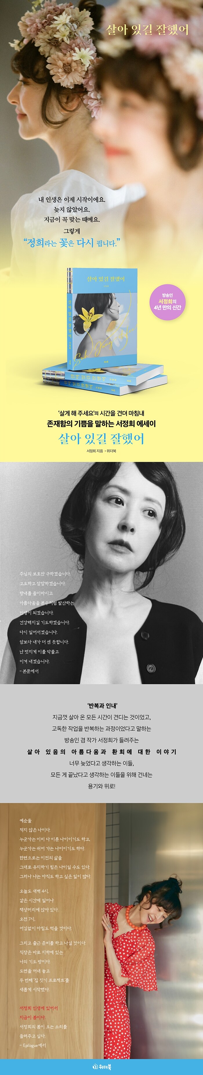 ¿Â ±¹¹ÎÀÌ ´Ù ¾Ëµµ·Ï ¼öÄ¡½º·¯¿ò ³¡¿¡ ÀÌÈ¥Çϰí, ´Ù½Ã ¼ûÀ» °í¸¥ µÚ »ì¾Æ º¼±î ÇÒ ¶§ ã¾Æ¿Â À¯¹æ¾Ï. ¿À¸¥ÂÊ °¡½¿ ÀüÀýÁ¦ ¼ö¼ú ÈÄ ºÒÀ» ¸ÔÀº µí Ç×¾Ï ºÎÀÛ¿ëÀ¸·Î °íÅë °¡¿îµ¥ ÀÖÀ» ¶§, »ç¶÷µéÀº ¡°ÀÌÁ¦ ¼Á¤Èñ´Â ³¡ÀÌ´Ù¡¯¡¯¶ó°í ¸»Çß´Ù. ÇÏÁö¸¸ »ì·Á Áֽô ÈûÀ¸·Î ÀÌÁ¦ ´Ù½Ã »ì¾Æ, ¡°»ì¾Æ ÀÖ±æ ÀßÇ߾ÀÇ ³¯À» »ì°í ÀÖ´Ù. ÀÌ Ã¥Àº ¡®³ª´Â ÀÌÁ¦ ³¡ÀÌ´Ù. ´Ù½Ã ÀϾ ÈûÀÌ ¾ø´Ù, Èñ¸ÁÀÌ ¾ø´Ù¡¯°í »ý°¢ÇÏ´Â »ç¶÷µé¿¡°Ô ¡°»ì¾Æ¸¸ ÀÖÀ¸¼¼¿ä. Á¶±Ý¸¸ ´õ °ßµð¸é ¡®»ì¾Æ ÀÖ±æ ÀßÇ߾¶ó°í ÇÒ ³¯ÀÌ °ð ¿Ã °Å¿¹¿ä¡±¶ó°í °Ý·ÁÇÑ´Ù. ¼Á¤Èñ°¡ 2017³âºÎÅÍ ÀÚ½ÅÀÇ ÀνºÅ¸±×·¥¿¡ ¿Ã¸° ±ÛÀ» ¾ö¼±ÇÏ¿© ¿«Àº °ÍÀÌ´Ù.