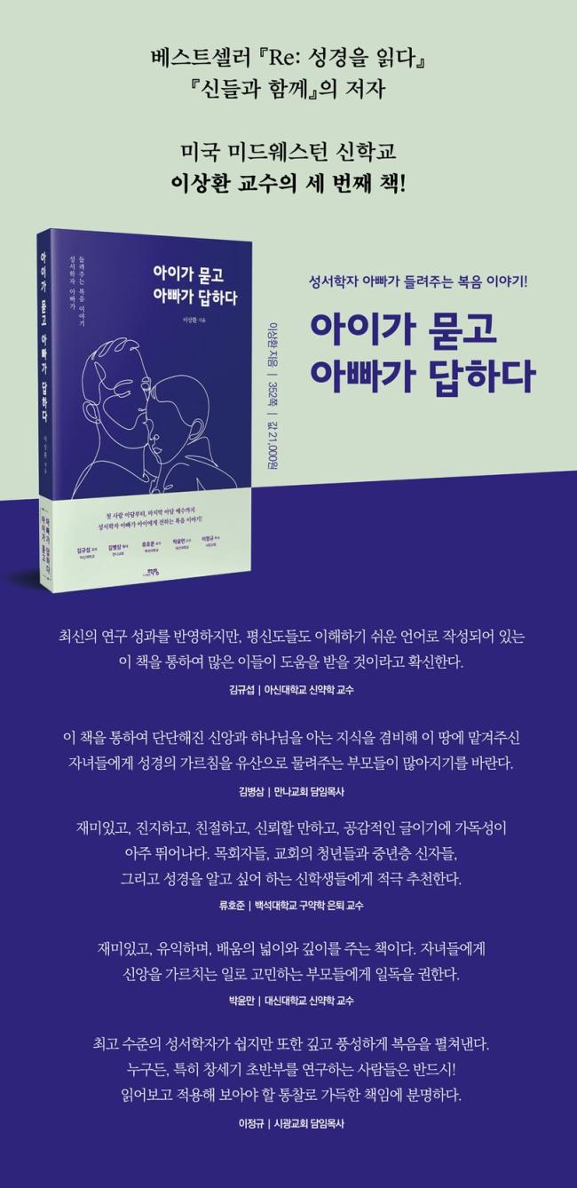 º£½ºÆ®¼¿·¯ ¡ºRe: ¼º°æÀ» Àд١», ¡º½Åµé°ú ÇÔ²²¡»ÀÇ ÀúÀÚ, ¹Ì±¹ ¹Ìµå¿þ½ºÅϽÅÇб³ ÀÌ»óȯ ±³¼öÀÇ ¼¼ ¹øÂ° Ã¥ÀÌ´Ù. ÀÌ Ã¥Àº ½ÇÁ¦·Î ÀúÀÚ°¡ Àú³á¸¶´Ù ÀÚ³àµé°ú ÇÔ²² ¼º°æÀ» °øºÎÇÏ¸ç ´ëȸ¦ ÁÖ°í¹ÞÀº ³»¿ëÀ» ¹ÙÅÁÀ¸·Î ¸¸µç Ã¥ÀÌ´Ù. ¾ÆÀ̵éÀÌ ¾Æºü¿Í ÇÔ²² â¼¼±â¸¦ ÀÐÀ¸¸ç ÀÚÀ¯·Ó°Ô Áú¹®À» ´øÁö¸é, ¾Æºü´Â ¼º¼ÇÐÀڷμÀÇ Àü¹®¼º ÀÖ´Â Áö½ÄÀ» ¹ÙÅÁÀ¸·Î ¾ÆÀ̵éÀÌ ÀÌÇØÇϱ⠽±°Ô ¼³¸íÇØÁØ´Ù.