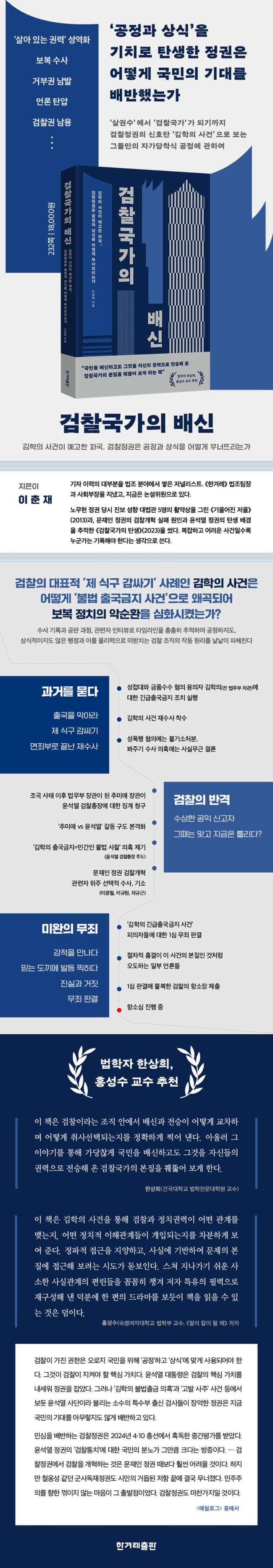 ±× ¹è½ÅÀÇ ÇÑ Ãà¿¡ ¡®°ËÂû¡¯ÀÌ ÀÖ´Ù.(207ÂÊ) ±Ç·Â°ú ÇÑ ¸öÀÌ µÈ °ËÂûÀº ¼ö»ç¿Í ±â¼ÒÀÇ Ä®³¯À» ¾î´À ¶§º¸´Ù ÆíÆÄÀûÀ¸·Î Èֵθ£¸ç ¹ý°ú Á¤ÀǸ¦ ¿ÀµµÇϰí ÀÖ´Ù. ¡®°øÁ¤¡¯°ú ¡®»ó½Ä¡¯À» ±âÄ¡·Î ź»ýÇÑ Á¤±Ç¿¡¼ ¾î¶»°Ô ÀÌ·± ÆÄÇàÀÌ ¹öÁ£ÀÌ ¹Ýº¹µÇ´Â °É±î? ¾Ç¼øÈ¯ÀÇ °í¸®¸¦ ²÷À» ¼ö ÀÖÀ»±î? ÀÌ Ã¥Àº ¹®ÀçÀÎ Á¤±Ç°ú À±¼®¿ °ËÂûÀÇ Ãæµ¹ÀÌ º»°ÝÈµÈ »ç°ÇÀÌÀÚ °ËÂûÁ¤±ÇÀÇ ½ÅȣźÀÌ µÈ ¡®±èÇÐÀÇ ºÒ¹ý Ãâ±¹±ÝÁö ÀÇȤ »ç°Ç¡¯ÀÇ ¸ðµç ŸÀÓ¶óÀÎÀ» ÃÎÃÎÈ÷ µû¶ó°¡¸ç ÀÌ »ç°ÇÀÌ ¹Ì¸® ¾Ï½ÃÇϰí ÀÖ´ø ÆÄ±¹ÀÇ Á¶Áüµé°ú À̸¦ °¡´ÉÇÏ°Ô ÇÑ ¡®°ËÂûÁ¤Ä¡¡¯ÀÇ ¹®¹ý°ú ÀÛµ¿ ¿ø¸®¸¦ ³¹³¹ÀÌ ÆÄÇìÄ£´Ù. ¡°³ÃÁ¤ÇÑ À̼ºÀÇ ÁöÇý°¡ ÇÊ¿äÇÑ ½ÃÁ¡, ½ÇÆÐ¸¦ ¹Ýº¹ÇÏÁö ¾Ê±â À§ÇØ¡±(È«¼º¼ö) ²À »ìÆìºÁ¾ß ÇÒ Ã¥ÀÌ´Ù.