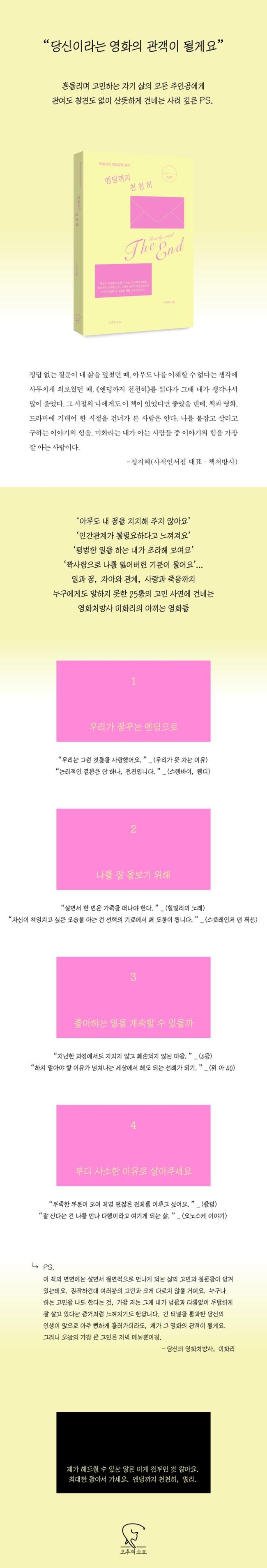 ¿µÈó¹æ»ç ¹Ìȸ®ÀÇ º»°Ý ¿µÈó¹æ ¿¡¼¼ÀÌ. ¿µÈ°¡ »îÀÇ Å©°í ÀÛÀº ¼ø°£¸¶´Ù ¸¶À½À» µé¿©´Ùº¸°Ô ÇØÁØ´Ù°í ¹Ï´Â À̹ÌÈ ÀÛ°¡°¡ ÀÏ»óÀÇ °í¹Î°ú ÀλýÀÇ Áú¹®µéÀ» ¸¶ÁÖÇÏ¸ç ¾Æ³¢´Â ¿µÈµéÀ» ²¨³»³õ¾Ò´Ù. °ü¿©µµ Âü°ßµµ ¾øÀÌ ´Ù¸¸ »ç·Á ±í°Ô °Ç³×´Â ÀÌ ½º¹°´Ù¼¸ ÅëÀÇ ¿µÈó¹æ ÆíÁö´Â ¶§·Î ¿µÈ ±í¼÷ÀÌ µé¾î°¡°í ¶§·Î ÀÚ½ÅÀÇ À̾߱⸦ Áø¼ÖÇÏ°Ô µé·ÁÁÖ¸ç, ¿ì¸®·Î ÇÏ¿©±Ý Àú¸¶´Ù ¹Ù¶ó´Â ¿£µùÀ» ´Ù½Ã±Ý ²Þ²Ù°Ô ÇÑ´Ù. ´©±¸³ª ÀÚ½ÅÀÌ ÁÖÀΰøÀÎ »î¿¡¼ ¡°¿£µù±îÁö õõÈ÷, ¸Ö¸®¡± °¡±â¸¦, ´ç½ÅÀ̶ó´Â ¿µÈÀÇ 1¿ °ü°´ÀÌ µÇ¾î ÀÀ¿øÇϴ åÀÌ´Ù.