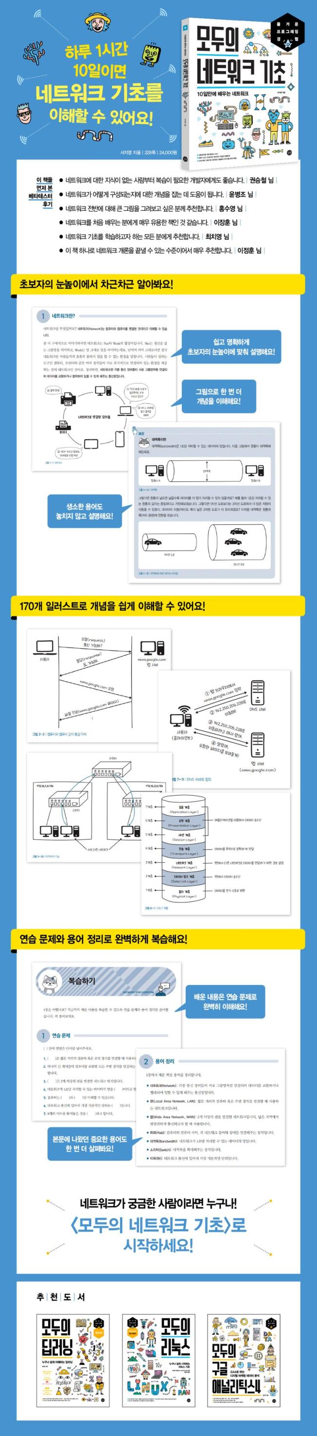ÀÌ Ã¥Àº ÀÌÁ¦ ¸· ³×Æ®¿öÅ©¸¦ °øºÎÇϱ⠽ÃÀÛÇ߰ųª °øºÎÇØ¾ß°Ú´Ù°í ¸¶À½¸ÔÀº ÃʱÞÀÚ¸¦ ´ë»óÀ¸·Î ÇÑ ÀÔ¹®¼´Ù. ³×Æ®¿öÅ©ÀÇ °³³ä, ºñÆ®, ·£, Çãºê µîÀÇ ³×Æ®¿öÅ© ±âÃÊ Áö½ÄÀ» ¼³¸íÇÑ µÚ, ¹°¸® °èÃþ, µ¥ÀÌÅÍ ¸µÅ© °èÃþ µî OSI 7 °èÃþÀ» À庰·Î ¼³¸íÇϰí, ¸¶Áö¸·À¸·Î ¹«¼± Åë½Å¿¡¼ÀÇ Åë½Å ±Ô°Ý°ú Á¢¼Ó ¹æ½Ä¿¡ ´ëÇØ ¼³¸íÇÑ´Ù. ½Ç»ýȰ ¿¹½Ã¿Í 170°³ ÀÏ·¯½ºÆ®·Î ½±°í Àç¹ÌÀÖ°Ô ³×Æ®¿öÅ© °ü·Ã Áö½ÄÀ» ÀÍÈú ¼ö ÀÖ´Ù. ¡º¸ðµÎÀÇ ³×Æ®¿öÅ© ±âÃÊ¡»·Î ´©±¸³ª ½±°Ô ³×Æ®¿öÅ©¸¦ ÀÍÇô º¸ÀÚ!