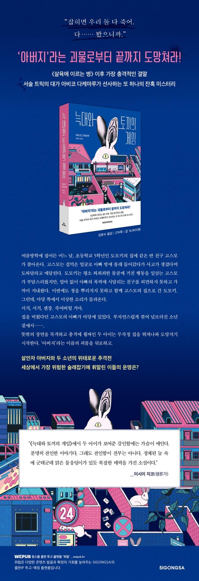 ÀÌ Ã¥ ¡¶´Á´ë¿Í Åä³¢ÀÇ °ÔÀÓ¡·Àº ÀÛ°¡°¡ ¡¶»ìÀ°¿¡ À̸£´Â º´¡· ÀÌÈÄ 20¿© ³â ¸¸¿¡ ¹ßÇ¥ÇÑ ÀåÆíÀ¸·Î, ¹ÝÀü°ú ¼¼ú Æ®¸¯ÀÌ µ¸º¸Àδٴ Á¡¿¡¼ ¡¶»ìÀ°¿¡ À̸£´Â º´¡·ÀÇ ¼ÓÆíÀ̶ó´Â ÆòÀ» ¹Þ°í ÀÖ´Ù. Æø·ÂÀûÀÎ ¾Æ¹öÁö¿Í ±×¿¡°Ô¼ ¹þ¾î³ª·Á´Â µÎ ¼Ò³âÀÇ ¾Æ½½¾Æ½½ÇÑ Ãß°ÝÀüÀº ¼Óµµ°¨ ³ÑÄ¡´Â Àü°³¿Í ¿¹Ãø ºÒÇãÀÇ ¹ÝÀü, ³î¶ó¿î °á¸»·Î À̾îÁö¸ç ¡¶»ìÀ°¿¡ À̸£´Â º´¡· ±× ´ÙÀ½À» ±â´Ù·Á¿Â À̵鿡°Ô ¸¸Á·½º·¯¿î µ¶¼ °æÇèÀ» ¾È°ÜÁÙ °ÍÀÌ´Ù.