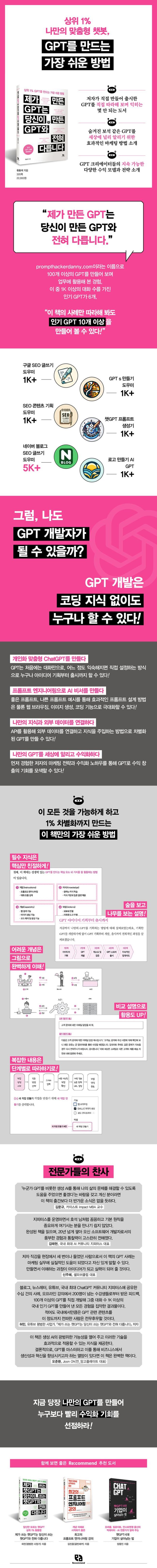 ÀÌ Ã¥Àº ¾îµð¿¡µµ Á¤¸®µÈ Àû ¾ø´Â GPT ¾ÆÀ̵ð¾î ±âȹºÎÅÍ Ãâ½Ã±îÁöÀÇ °úÁ¤, ´õ ¶È¶ÈÇÑ GPT¸¦ ¸¸µé±â À§ÇÑ È¿°úÀûÀÎ ÇÁ·ÒÇÁÆ® ÀÛ¼º ÆÁ°ú GPT ±â´É Ȱ¿ë¹ý, Â÷º°ÈµÈ ÃʰÝÂ÷ GPT¸¦ ¸¸µé±â À§ÇÑ GPT Áö½Ä ¹× API Ȱ¿ë¹ý, ±×¸®°í GPT¸¦ ¸¶ÄÉÆÃÇÏ°í ¼öÀÍÈÇÏ´Â Àü·«±îÁö Áý´ë¼ºÇß´Ù. °³¹ßÀÚ°¡ ¾Æ´Ï¾îµµ, º¹ÀâÇÑ ÇÁ·Î±×·¡¹Ö Áö½ÄÀÌ ¾ø¾îµµ ÀúÀÚ°¡ ¸¸µé¾î ±¹³»¿¡¼ Àα⸦ ¾òÀº GPT¸¦ Á÷Á¢ µû¶óÇØ º¼ ¼ö ÀÖµµ·Ï ±¸¼ºÇß´Ù. ÀÌ Ã¥ ÇÑ ±Ç¸¸ µû¶óÇØµµ ½ÃÇàÂø¿À ¾øÀÌ Àαâ GPT 10°³ ÀÌ»óÀ» ¸¸µé¾î º¸´Â °ÍÀº ¹°·Ð, »óÀ§ 1%µéÀÇ GPT ¸¸µå´Â ÃÖ°íÀÇ ³ëÇϿ츦 °¡Àå ½¬¿î ¹æ¹ýÀ¸·Î ¹è¿ï ¼ö ÀÖ´Ù.