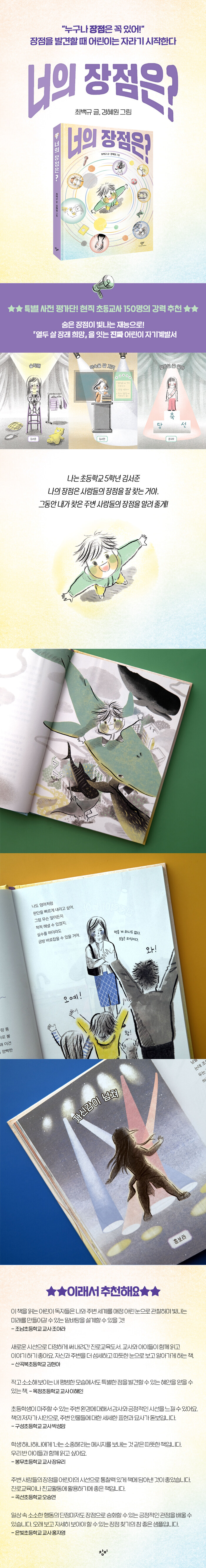 ¾î¸°À̸¦ À§ÇÑ ÀåÁ¡ ¹ß°ß ¾È³»¼ ¡º³ÊÀÇ ÀåÁ¡Àº?¡». ¾ö¸¶¿Í ¾Æºü, Ä£±¸¿Í ¼±»ý´Ô, ¹Ý·Á°ß°ú ºñ¹Ð ÀϱâÀå µî ¼¼»ó ¸ðµç Á¸Àç¿¡¼ ÀåÁ¡À» ¹ß°ßÇÏ´Â ºñ°áÀ» ¾Ë·Á ÁØ´Ù. ÀÚ½ÅÀ» µÑ·¯½Ñ ¼¼°èÀÇ ÀåÁ¡À» Çϳª¾¿ ¹ß°ßÇØ °¡¸ç ¾î¸°À̵éÀº Àڱ⠹߰߰ú Àڱ⠱àÁ¤ÀÇ °¨°¢À» ÀÍÈ÷°í, ³ÐÀº ¸¶À½À¸·Î ¼¼»óÀ» ¹Ù¶óº¸´Â ½Ã°¢À» °¡Áö°Ô µÉ °ÍÀÌ´Ù. ¡®¹«¾ùÀÌµç ±àÁ¤ÀûÀ¸·Î »ý°¢ÇÏ´Â °Í¡¯ÀÌ ÀåÁ¡ÀÎ ÃÖ¹é±Ô ½ÃÀÎÀÇ ±Û°ú ¡®»ç¶÷µéÀÇ ±Í¿©¿òÀ» Àß ¹ß°ßÇÏ´Â °Í¡¯ÀÌ ÀåÁ¡ÀÎ °æÇý¿ø ÀÛ°¡ÀÇ ±×¸²ÀÌ Á¶È¸¦ ÀÌ·ç¸ç ¾î¸°À̵鿡°Ô ÇÑÃþ ´õ Ä£±ÙÈ÷ ´Ù°¡°£´Ù.