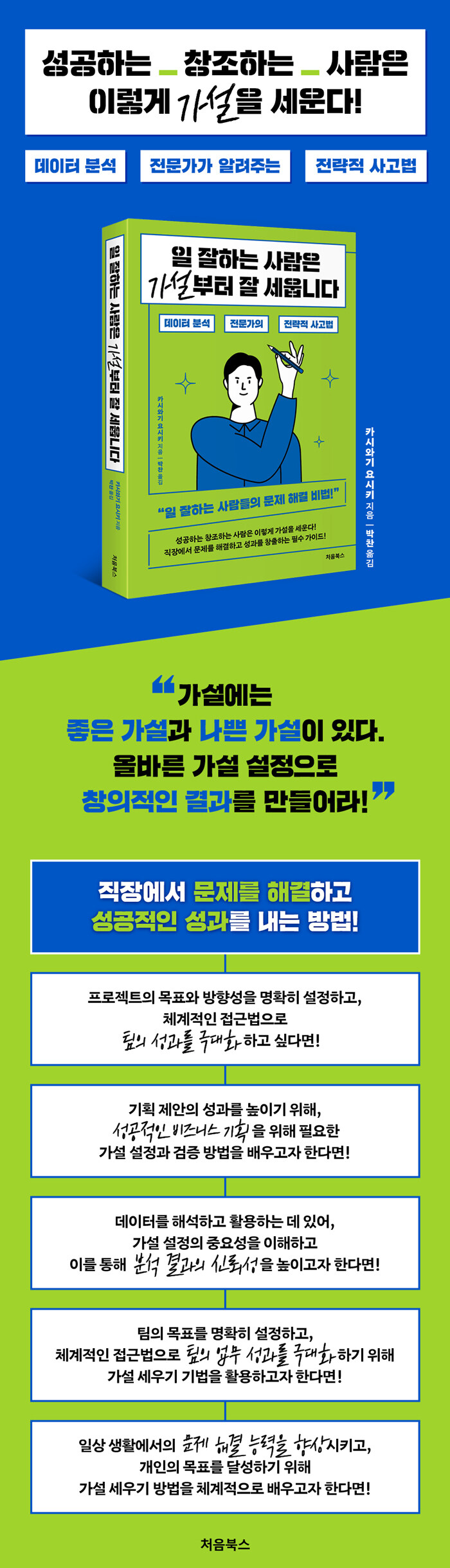 ¶ÇÇÑ ÀúÀÚ´Â »ç¶÷µéÀÌ º¸Åë 'ÀÚ½ÅÀÇ °æÇèÀ» ¹ÙÅÁÀ¸·Î' °¡¼³À» ¼¼¿ì°Ô µÈ´Ù°í ¸»ÇÕ´Ï´Ù. ±×·¯³ª ±×°Í¸¸À¸·Î´Â ÁÁÀº °¡¼³À» ¼¼¿ì±â¿¡ ÃæºÐÇÏÁö ¾Ê½À´Ï´Ù. ÀúÀÚ´Â ¿Ö »ç¶÷µéÀÌ ÁÁÀº °¡¼³À» ¼¼¿ì±â ¾î·Á¿öÇÏ´ÂÁö, ÁÁÀº °¡¼³À̶õ ¹«¾ùÀÎÁö, ±×¸®°í °æÇèÀÇ ÇѰ踦 ¶Ù¾î³Ñ¾î ÁÁÀº °¡¼³À» ¼¼¿ì±â À§ÇÑ ÇØ°áÃ¥Àº ¹«¾ùÀÎÁö ¼³¸íÇÕ´Ï´Ù. ÀÌ, Ã¥Àº ´Ü¼øÈ÷ µ¥ÀÌÅÍ ºÐ¼® ±â¼úÀ̳ª ÀÌ·ÐÀû Áö½ÄÀ» ³Ñ¾î, ½ÇÁúÀûÀÎ °¡¼³ ¼³Á¤°ú °ËÁõ, Æò°¡ °úÁ¤À» ÅëÇØ µ¶ÀÚµéÀÌ ÀÏÀ» ÇÒ ¶§º¸´Ù Å« ¼º°ú¸¦ ´Þ¼ºÇϵµ·Ï µµ¿ï °ÍÀÔ´Ï´Ù.