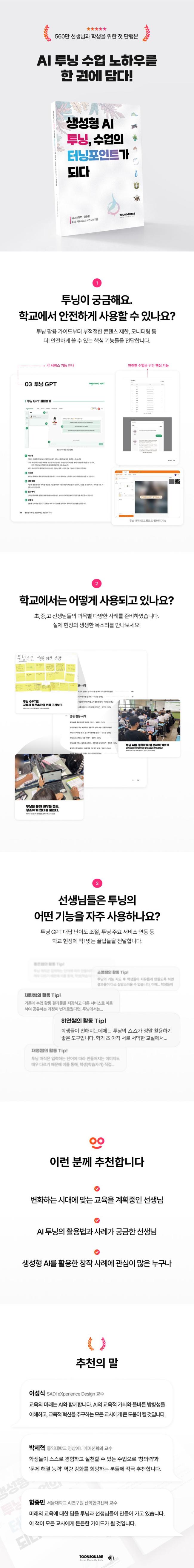 ºü¸£°Ô º¯ÈÇÏ´Â ½Ã´ë¿¡ ¸ÂÃç ±³À°µµ º¯ÈÇϰí ÀÖ½À´Ï´Ù. ÀÏ»ó ¼Ó¿¡ ½º¸çµç AI, ±× Áß »ý¼ºÇü AI¿¡ ´ëÇÑ ±³À°ÀÌ È®»êµÇ´Â ¿À´Ã³¯, ¿ì¸® ¾ÆÀ̵éÀº »ý¼ºÇü AI¿Í ÇÔ²² Á÷¸éÇÑ ¹®Á¦µéÀ» ÁÖµµÀûÀ¸·Î ÇØ°áÇϰí, ÀÚ½ÅÀÇ »ý°¢À» Ç¥ÇöÇÏ´Â ¿ª·®À» ±æ·¯¾ß ÇÕ´Ï´Ù. Åõ´×Àº ÇØ´ç Ã¥À» ÅëÇØ »ý¼ºÇü AI Åõ´×ÀÌ °¡Áø ±³À°Àû °¡Ä¡¸¦ °øÀ¯Çϰí, ¿ì¸® ÇлýµéÀÇ Èñ¸ÁÂù ¹Ì·¡¿Í, ²÷ÀÓ¾øÀÌ AI ±³À°À» ¿¬±¸ÇÏ´Â ±³»çµéÀÇ ¹Ì·¡ ±³À°À» Áö¿øÇϰíÀÚ ÇÕ´Ï´Ù. Åõ´×Àº Çб³ ¸ÂÃãÇü ¼ºñ½º·Î, Ŭ¸¯¸¸À¸·Î ÇлýµéÀÌ º»ÀÎÀÇ »ó»óÀ» Ç¥ÇöÇÏ°í ½º½º·Î ¹®Á¦¿¡ ´ëÇÑ ´äÀ» Ž»öÇÒ ¼ö ÀÖµµ·Ï ÇÕ´Ï´Ù. ¡´»ý¼ºÇü AI Åõ´×, ¼ö¾÷ÀÇ ÅÍ´× Æ÷ÀÎÆ®°¡ µÇ´Ù vol.1 ÃʵîÆí / ÁßµîÆí¡µÀº Åõ´×ÀÇ ±âº» »ç¿ë¹ýºÎÅÍ È°¿ë¹ý±îÁö ´õ ¾ÈÀüÇϰí È¿°úÀûÀ¸·Î Àû¿ëÇÒ ¼ö ÀÖµµ·Ï °¡À̵带 Á¦½ÃÇϸç, »ý¼ºÇü AI¿¡ ´ëÇÑ ´õ ¾ÈÀüÇÑ ±³À°À» Èñ¸ÁÇÏ´Â ºÐ²² µçµçÇÑ ÀÌÁ¤Ç¥°¡ µÇ¾îÁÙ °ÍÀÔ´Ï´Ù.