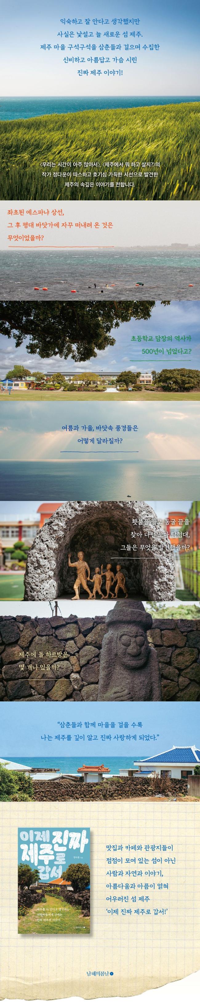 ÀÌ Ã¥Àº Á¦ÁÖ ¸¶À»À» »ïÃáµé°ú ÇÔ²² °È°í ¼öÁýÇÏ¿© ¸¸µé¾ú´Ù. Æò´ë ¾Õ¹Ù´Ù¿¡ ÁÂÃÊµÈ ¿¡½ºÆÄ³Ä »ó¼±¿¡ ¾ôÈù À̾߱â, ȶºÒ°ú ³ë²öÀ» µé°í µ¿±¼ ŽÇè¿¡ ³ª¼¹´ø ²¿¸¶ ŽÇè´ëÀÇ ¸ðÇè, 500³â ³ÑÀº ÃʵîÇб³ ´ãÀåÀÇ ¿ª»ç, ¿©ÇàÀÚ°¡ ´Ù ºüÁ®³ª°£ µÚÀÇ ¿ìµµ dz°æ µî ¸¶À» »ç¶÷µé¸¸ ¾Æ´Â ¾Æ¸§´ä°í ½ÅºñÇϰí Èï¹Ì·Î¿î Á¦ÁÖ À̾߱â. ±×³É Áö³ªÄ¥ ¼ö ÀÖ´Â ¼Ò¹ÚÇÑ Ç³°æµµ ¸¶À» »ïÃáµé¿¡°Ô ¼ûÀº À̾߱⸦ µè°í, ÁÁÀº ¿©Çà Ä£±¸¿Í ¼ö´Ù ¶³ µí °ö¾Ã´Ù º¸¸é ¼¼»ó¿¡¼ °¡Àå ºû³ª´Â Áø±ÍÇÑ º¸¹°·Î ´Ù°¡¿Â´Ù. ¡´ÀÌÁ¦ ÁøÂ¥ Á¦ÁÖ·Î °©¼¡µÀÇ Ã¥ÀåÀ» ³Ñ±â´Ù º¸¸é ¸¶À» »ïÃá, ¿©Çà Ä£±¸¿Í ÇÔ²² °È´Â ±âºÐÀ» ´À³¥ ¼ö ÀÖ´Ù. ±×¸®°í ¾î¼¸é Á¦ÁÖ¿Í »ç¶û¿¡ ºüÁúÁöµµ ¸ð¸¥´Ù.