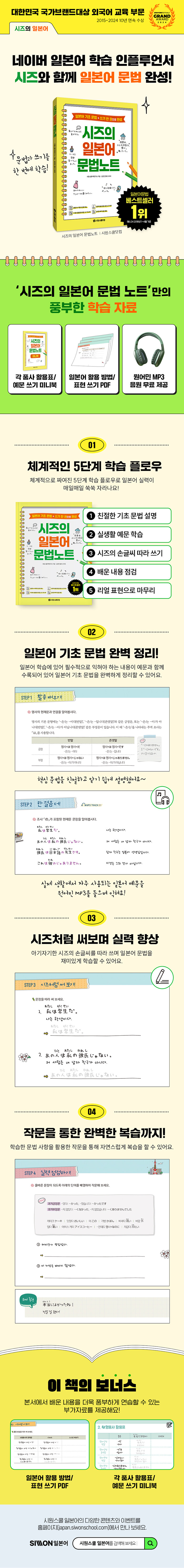 ¡º½ÃÁîÀÇ ÀϺ»¾î ¹®¹ý³ëÆ®¡»´Â ³×À̹ö ÀϺ»¾î ÇнÀ ÀÎÇ÷ç¾ð¼ ¡®½ÃÁÀÇ ÀϺ»¾î °øºÎ ³ëÇϿ츦 ³ì¿©, ÀϺ»¾î ÇнÀ¿¡ ÀÖ¾î ÇʼöÀûÀ¸·Î ÀÍÇô¾ß ÇÏ´Â ±âÃÊ ¹®¹ýÀ» Á¤¸®ÇÏ¿© ´ã¾Æ³õÀº µµ¼ÀÔ´Ï´Ù. ÀÚÄ© Áö·çÇÏ°Ô ´À²¸Áú ¼ö ÀÖ´Â ÀϺ»¾î ¹®¹ýÀ», ½ÃÁîÀÇ ±Û¾¾¸¦ µû¶ó ¾²¸é¼ Àç¹ÌÀÖ°Ô ÇнÀÇÒ ¼ö ÀÖµµ·Ï ±¸¼ºµÇ¾î ÀÖ½À´Ï´Ù.
