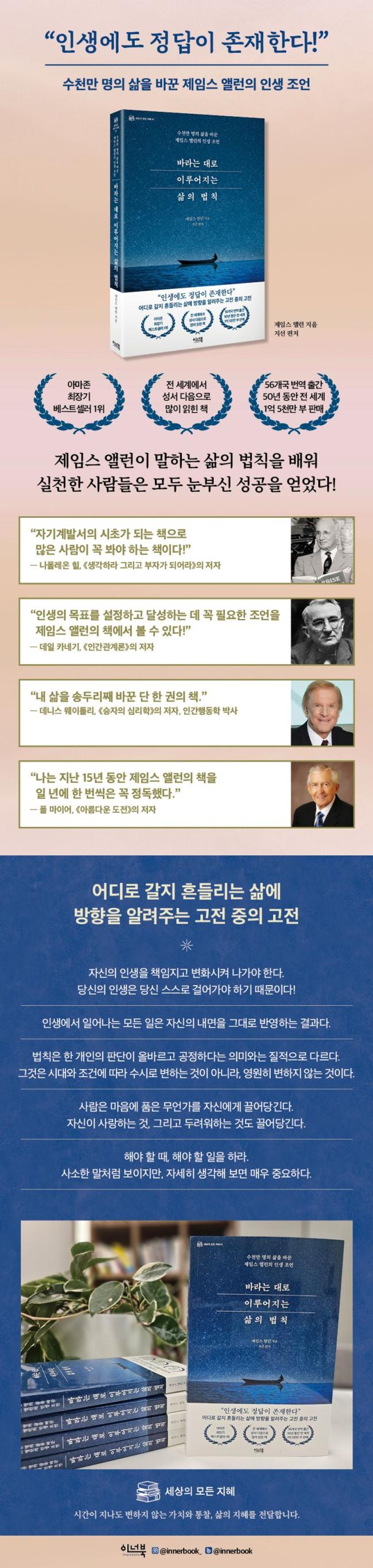 ½Ã°£ÀÌ Áö³ªµµ º¯ÇÏÁö ¾Ê´Â °¡Ä¡¿Í ÅëÂû, »îÀÇ ÁöÇý¸¦ Àü´ÞÇÏ´Â ¡®¼¼»óÀÇ ¸ðµç ÁöÇý ½Ã¸®Á ù ¹øÂ° Ã¥ ¡º¹Ù¶ó´Â ´ë·Î ÀÌ·ç¾îÁö´Â »îÀÇ ¹ýÄ¢¡»ÀÌ Ãâ°£µÆ´Ù. ÀÌ Ã¥ÀÇ ÀúÀÚÀÎ Á¦ÀÓ½º ¾Ù·±Àº ÀλýöÇÐÀÚÀÌÀÚ ÀÚ±â°è¹ß¼ÀÇ ½ÃÃʰ¡ µÇ´Â ¡º³ª¸¦ ¹Ù²Ù¸é ¸ðµç °ÍÀÌ º¯ÇÑ´Ù(As a Man Thinketh)¡»¸¦ Æ÷ÇÔÇØ ÃÑ 19±ÇÀÇ Ã¥À» Ãâ°£Çß´Ù. ±×°¡ ¾´ ±ÛµéÀº ³ªÆú·¹¿Â Èú, µ¥ÀÏ Ä«³×±â, ¾ó ³ªÀÌÆÃ°ÔÀÏ µî ¸¹Àº »ç¶÷¿¡°Ô ¿µÇâÀ» ³¢ÃÆ´Ù. ½Ã´ë´Â ´Þ¶óµµ ¿©ÀüÈ÷ ±×ÀÇ ÅëÂû°ú ÁöÇý´Â ¿ì¸®¿¡°Ô ¾î¶»°Ô »ì¾Æ¾ß ÇÏ´ÂÁö ÀλýÀÇ ¹æÇâÀ» °áÁ¤ÇÏ´Â µ¥ ¸¹Àº µµ¿òÀ» ÁØ´Ù. Á¦ÀÓ½º ¾Ù·±ÀÇ Ã¥ 19±Ç °¡¿îµ¥ °¡Àå Àαâ ÀÖ´Â µµ¼ µÎ ±ÇÀ» °¢»öÇØ ¡º¹Ù¶ó´Â ´ë·Î ÀÌ·ç¾îÁö´Â »îÀÇ ¹ýÄ¢¡»¿¡ ´ã¾Ò´Ù. ƯÈ÷ Á¦ÀÓ½º ¾Ù·±¿¡°Ô Áö´ëÇÑ ¿µÇâÀ» ³¢Ä£ Å罺ÅäÀÌÀÇ ¸í¾ð°ú ÇÔ²² Èú¸µÇÏ´Â ¸¶À½À¸·Î µ¶¼ÇÒ ¼ö ÀÖµµ·Ï ¸íȵµ ÁغñÇß´Ù. ÀÌ Ã¥À» ÅëÇØ µ¶ÀÚºÐµé ¸ðµÎ ¹Ù¶ó´Â ´ë·Î ÀÌ·ç¾îÁö´Â »îÀÇ ¹ýÄ¢À» ±ú´Ý°í, Èçµé¸®´Â Àλý¿¡¼ ÀÚ½ÅÀ» ÁöŰ´Â ´Ü´ÜÇÑ ¸¶À½À» ¾ò°Ô µÉ °ÍÀÌ´Ù.