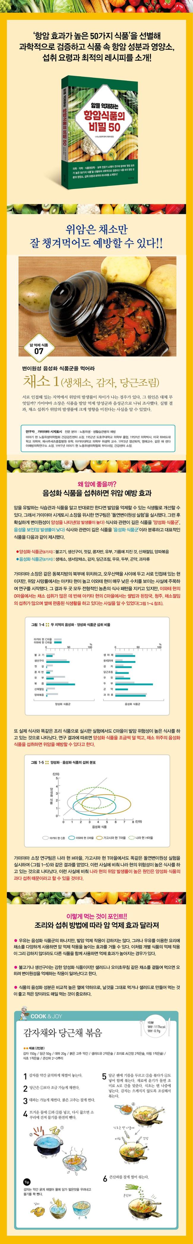 ¾Ï ¿¹¹æ ¹× Ä¡À¯ÀÇ Ã¹Â° Á¶°ÇÀº ½Ä»ýȰ °³¼±ÀÌ´Ù!! ¾ÏÀ» ¿¹¹æÇÏ´Â Ç׾ϽÄǰÀº Ưº°ÇÑ °ÍÀÌ ¾Æ´Ï¶ó ¿ì¸®°¡ Àϻ󿡼 Áñ°Ü¸Ô´Â Æò¹üÇÑ È£¹Ú, ¾çÆÄ, °¨ÀÚ, ½Ã±ÝÄ¡, ¹ö¼¸, Äá, »ç°ú µîÀÌ´Ù. ÀÌµé ½Äǰ¿¡´Â Ç×¾Ï È¿°ú°¡ ¶Ù¾î³ Ç×¾Ï ¼ººÐ°ú ¿µ¾ç¼Ò°¡ °¡µæ µé¾îÀֱ⠶§¹®ÀÌ´Ù. ÇÏÁö¸¸ Ç׾ϽÄǰµµ ¾î¶»°Ô Á¶¸®Çؼ ¸Ô´À³Ä¿¡ µû¶ó Ç×¾Ï È¿°ú°¡ ¶³¾îÁú ¼öµµ ¹è°¡µÉ ¼öµµ Àֱ⿡ ¿ì¸®°¡ ¾Ë°í ÀÖ´ø °Í°ú´Â ´Ù¸¥ ¼·Ãë ¹æ¹ýÀ» °´°üÀûÀÎ ¿¬±¸ ÀÚ·á¿Í ÇÔ²² Á¦½ÃÇϰí ÀÖ´Ù. °³º° ½Äǰ¸¶´Ù ½Å¼±ÇÑ ½ÄÀç·á¸¦ °í¸£´Â ¹æ¹ý°ú È¿°úÀûÀÎ ¼·Ãë ¿ä·É, ±×¸®°í ±×¿¡ µû¸¥ ÃÖÀûÀÇ ·¹½ÃÇǵµ ÇÔ²² ¼Ò°³ÇÑ´Ù. Å丶Åä ¾ßä¼öÇÁ, °¨ÀÚ µ¿±×¶û¶¯, ´ÜÈ£¹Ú°ú ´ç±Ù »ø·¯µå, ÆØÀ̹ö¼¸ººÀ½, ´Ù½Ã¸¶ ¾î¹¬ Âî°³, °í±¸¸¶ ±ú °æ´Ü°ú °°ÀÌ ÇØ´ç ½ÄǰÀ» ÀÌ¿ëÇÑ 50°¡Áö ¿ä¸®¸¦ ÇÔ²² ¼±º¸¿© ¾Ï ȯÀÚ¿Í ±× °¡Á·µé, °¡Á·ÀÇ °Ç°À» »ý°¢ÇÏ´Â ÀϹÝÀε鿡°Ôµµ µµ¿òÀÌ µÉ °ÍÀÌ´Ù.