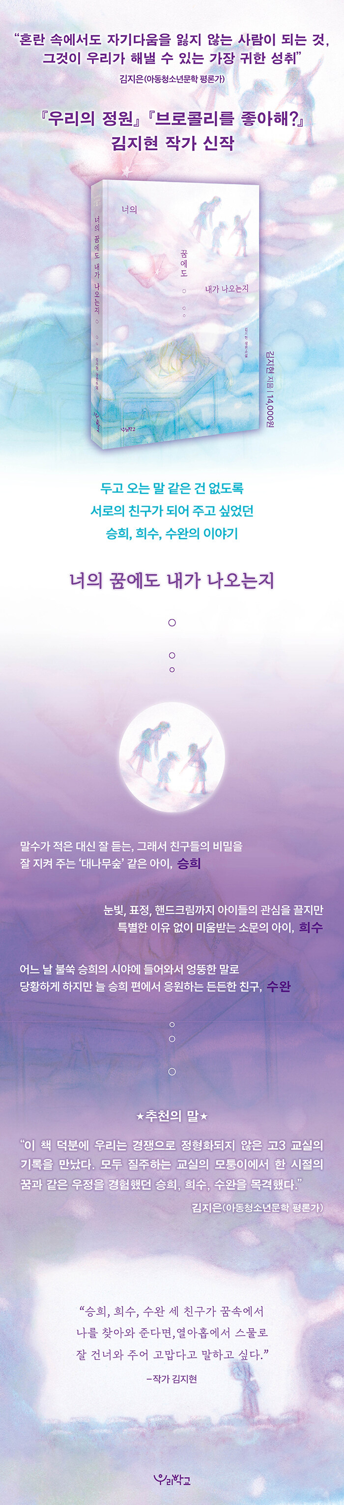±èÁöÀº ¾Æµ¿Ã»¼Ò³â¹®ÇÐ Æò·Ð°¡´Â °í3, ¿¾ÆÈ©, ¾î¸¥ÀÌ µÇ±â Á÷Àü¿¡ ¸¸³ ½ÂÈñ, Èñ¼ö, ¼ö¿Ï ¼¼ ¾ÆÀ̸¦ ¡°¿ìÁ¤ÀÇ À̸§À¸·Î ¹¶¶×±×·ÁÁöÁö ¾Ê´Â¡± °ü°è¶ó°í ¸»ÇÑ´Ù. ¡®Ä£±¸¡¯¶ó´Â ¸íÈ®ÇÏ°í ´Ü´ÜÇÑ À̸§À¸·Î ¹ÀÌÁö ¾Ê´Â °ü°è¸¦ ÅëÇØ ¡°¼¼ »ç¶÷ÀÌ Çϳª°¡ µÇ¾ú´Ù´Â »ÑµíÇÑ °¨°¢º¸´Ù ´õ ¼¼¹ÐÇÏ°Ô ±×·ÁÁö´Â °ÍÀº, °¢ÀÚÀÏ ¶§ÀÇ ¿Ü·Î¿ò°ú »çÁ¤À» ¸»ÇÒ ¼ö ¾øÀ» ¶§ÀÇ ³Ã³ÇÔ¡±À̶ó¸ç, ¡°¾î¶² ¾ÆÇÄÀº ¾Æ¹«¿¡°Ôµµ ¸»ÇÒ ¼ö ¾ø´Ù´Â °Í, ±× ¹«°Ô¸¦ Áû¾îÁö°í °¡´Â °ÍÀÌ ¾î¸¥ÀÌ µÇ´Â ÀÏ¡±ÀÌ¶ó ¸»ÇÑ´Ù. ±×·³¿¡µµ ¡°¿ì¸®¸¦ ¼ºÀå½ÃŰ´Â °ÍÀº ÀÌ·¯ÇÑ ºÒÈ®½Ç¼º¡±À̶ó°í µ¡ºÙÀδÙ.