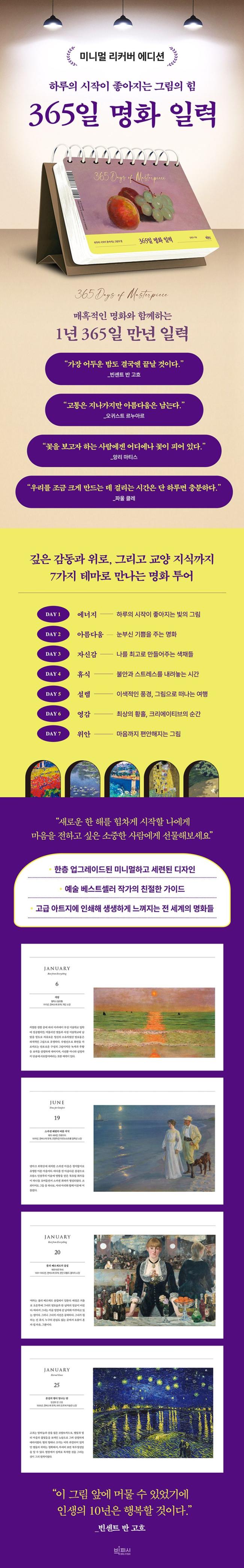 ¿Àµô·Õ ¸£µ¿ÀÇ Á¤¹°È°¡ ´ã±ä Çö´ëÀûÀÎ ´À³¦ÀÇ Ç¥Áö µðÀÚÀÎÀ» ºñ·ÔÇØ, Á¶±Ý ´õ ¡®¸íÈ °¨»ó¡¯ ±× ÀÚü¿¡ ÁýÁßÇÒ ¼ö ÀÖµµ·Ï ÇÏ´Â ¹Ì´Ï¸ÖÇÑ ½ºÅ¸ÀÏÀÇ º»¹® µðÀÚÀÎÀº ¶Ç ´Ù¸¥ µ¶¼ÀÇ ÇູÀ» ¼±»çÇÒ °ÍÀÌ´Ù. ÀÌÁ¦ ¡¶365ÀÏ ¸íÈ ÀϷ¡·°ú ÇÔ²² ¸ÅÀÏ ¹Ù·Î ³» Ã¥»ó À§¿¡¼ ¼¼°èÀÇ ´«ºÎ½Å ¸íȵéÀ» ¼Õ½±°Ô ¸¸³ªº¸ÀÚ. ±è¿µ¼÷ ÀÛ°¡ÀÇ Ä£ÀýÇÏ°íµµ Àç¹ÌÀÖ´Â ÇØ¼³Àº ÀÌ Ã¥¿¡¼ ¸¸³¯ ¼ö ÀÖ´Â ¶Ç ÇϳªÀÇ ±â»ÝÀÌ´Ù. ¿Ã ¿¬¸», »õ·Î¿î ÇÑ ÇØ¸¦ ÈûÂ÷°Ô ½ÃÀÛÇÒ ³ª¿Í ¸¶À½À» ÀüÇÏ°í ½ÍÀº ¼ÒÁßÇÑ »ç¶÷¿¡°Ô ¡¶365ÀÏ ¸íÈ ÀϷ¡·Àº ÃÖ°íÀÇ ¼±¹°ÀÌ µÇ¾îÁÙ °ÍÀÌ´Ù.