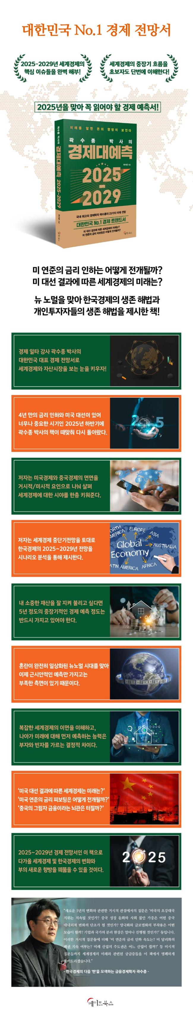 2023³â¿¡ ù Ãâ°£µÇ¾î µ¶ÀÚµéÀÇ ±ØÂù°ú È£ÆòÀ» ¹ÞÀº °û¼öÁ¾ ¹Ú»çÀÇ ´ëÇѹα¹ ´ëÇ¥ °æÁ¦ Àü¸Á¼°¡ ±Ý¸® ÇǺ¸ÆÃ°ú ¹Ì±¹ ´ë¼±ÀÌ ÀÖ¾î ³Ê¹«³ªµµ Áß¿äÇÑ ½Ã±âÀÎ 2025³â ÇϹݱ⿡ ¶§¸ÂÃç ´Ù½Ã µ¹¾Æ¿Ô´Ù. Àú¸íÇÑ °æÁ¦ÇÐÀÚ °û¼öÁ¾ ¹Ú»ç´Â ÃֽŠ±Û·Î¹ú °æÁ¦ ÁöÇ¥¿Í µ¥ÀÌÅ͸¦ 100% ¹Ý¿µÇØ 2023³â 11¿ù¿¡ Ãâ°£µÈ ÀüÀÛÀÇ Á¤º¸¸¦ ¿ÏÀüÈ÷ ¾÷µ¥ÀÌÆ®Çß°í, ¼¼°è ÁÖ¿ä ±â°üµéÀÌ Æò°¡ÇÑ °æÁ¦Àü¸Á°ú ÁÖ¿ä ±¹°¡µéÀÇ °æÁ¦ ȯ°æ ºÐ¼®À» ÅëÇØ ¼¼°è°æÁ¦ÀÇ ÁßÀå±â ¹Ì·¡¸¦ ¿¹ÃøÇϰí, ³ª¾Æ°¡ À§±â¿¡ óÇÑ Çѱ¹°æÁ¦ÀÇ Áö¼Ó°¡´ÉÇÑ ¼ºÀå Àü·«À» Á¦½ÃÇÑ´Ù. ¼ÒÁßÇÑ Àç»êÀ» ÁöŰ°í ½Í°Å³ª °æÁ¦È°µ¿À» Çϰųª ±â¾÷À» °æ¿µÇϰí ÀÖ´Ù¸é 5³â Á¤µµÀÇ ÁßÀå±âÀûÀÎ °æÁ¦ ¿¹Ãø Á¤µµ´Â °¡Áö°í ÀÖ¾î¾ß ÇÑ´Ù. È¥¶õ°ú ºÒÈ®½Ç¼ºÀÌ ÀÏ»óÈµÈ ´º³ë¸Ö ½Ã´ë¸¦ ¸Â¾Æ ÀÌÁ¦ ±Ù½Ã¾ÈÀûÀÎ ¿¹Ãø¸¸ °¡Áö°í´Â ºÎÁ·ÇÑ Ãø¸éÀÌ Àֱ⠶§¹®ÀÌ´Ù. ¹Ì·¡¿¡ ´ëÇØ ¸ÕÀú ¿¹ÃøÇØ µ·ÀÇ Çâ¹æÀ» Àо´Â ´É·ÂÀº ºÎÀÚ¿Í ºóÀÚ¸¦ °¡¸£´Â °áÁ¤Àû Â÷À̶ó ÇÒ ¼ö ÀÖ´Ù. ½º¸¶Æ®ÇÑ °æÁ¦»ýȰ°ú ÀÚ»ê°ü¸®¸¦ À§Çؼ´Â º¹ÀâÇÏ°Ô ¾ôÈù ¼¼°è°æÁ¦ÀÇ ÇöÀç¿Í ¹Ì·¡¸¦ ÀÌÇØÇÏ´Â ÈûÀÌ ¹Ýµå½Ã ÇÊ¿äÇÏ´Ù. ƯÈ÷ ¿äÁò °°Àº ºÒÈ®½Ç¼ºÀÇ ½Ã´ëÀϼö·Ï 5³â Á¤µµ¸¦ ³»´Ùº¸´Â ÁßÀå±âÀûÀÎ °æÁ¦ Àü¸ÁÀº ´õ¿í ÇÊ¿äÇÏ´Ù. ÀÌ Ã¥ ÇÑ ±ÇÀ¸·Î ´Ù°¡¿Ã ¼¼°è°æÁ¦ ±¸µµÀÇ º¯È¿Í ºÎÀÇ »õ·Î¿î Çâ¹æÀ» ²ç¶ÕÀ» ¼ö ÀÖÀ» °ÍÀÌ´Ù.