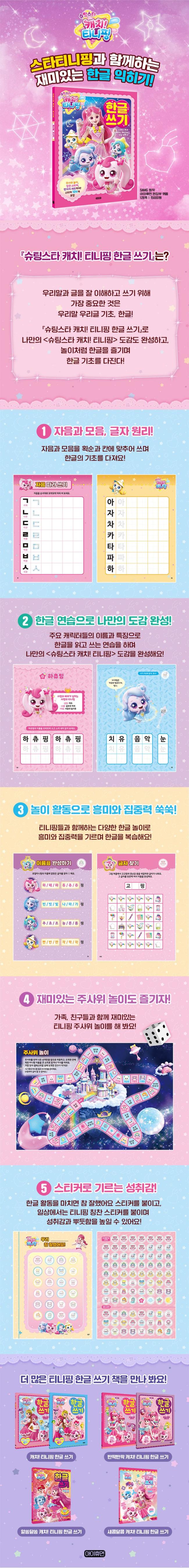 ¡º½´ÆÃ½ºÅ¸ ijġ! Ƽ´ÏÇÎ ÇÑ±Û ¾²±â¡»¿¡¼ ¾î¸°À̵éÀº ¸ÕÀú ÀÚÀ½°ú ¸ðÀ½, ±âº» ±ÛÀÚ¸¦ ±¹¾î °øÃ¥ÀÇ Á¤»ç°¢Çü¿¡ ¸ÂÃß¾î ¾¹´Ï´Ù. À̶§ ±ÛÀÚÀÇ Á¤È®ÇÑ È¹¼øÀ» ÀÍÈ÷°í ÀÚÀ½°ú ¸ðÀ½ÀÌ ¸ð¿© ±ÛÀÚ°¡ µÇ´Â ¿ø¸®¸¦ ÀÌÇØÇϸç, ÇÑ±Û ¾²±âÀÇ ±âÃʸ¦ È®½ÇÈ÷ ´ÙÁú ¼ö ÀÖ½À´Ï´Ù. ±×·± ´ÙÀ½ ÁÖÀΰø ·Î¹Ì¿Í ÇÏÃòÇÎ, »õ·Î¿î ·Î¿Æ¼´ÏÇΰú È·ÁÇÑ ½ºÅ¸Æ¼´ÏÇÎÀ» ºñ·ÔÇØ ¡´½´ÆÃ½ºÅ¸ ijġ! Ƽ´ÏÇΡµ ¼Ó ij¸¯Å͵éÀ» ¸¸³ª º»°ÝÀûÀÎ ÇÑ±Û ¾²±â¿Í Àб⸦ ¿¬½ÀÇÕ´Ï´Ù. ¾î¸°À̵éÀº ÁÁ¾ÆÇϴ ij¸¯ÅÍÀÇ À̸§°ú ¿¬°ü ´Ü¾î¸¦ µû¶ó ¾²¸ç ¼Õ°¡¶ô Èûµµ ±â¸£°í Áñ°Ì°Ô ÇѱÛÀ» ¿¬½ÀÇÒ ¼ö ÀÖ½À´Ï´Ù. À̶§ ÇÑ±Û Àб⠽Ƿµµ Ű¿ì°í ÁÁ¾ÆÇϴ ij¸¯ÅÍ¿¡ ´ëÇØ ¾Ë¾Æ °¡´Â Àç¹Ìµµ ´À³¢µµ·Ï ij¸¯ÅÍ Æ¯Â¡°ú ¼Ò°³±îÁö ³Ö¾ú½À´Ï´Ù. ÀÌ·¸°Ô ÇÑ±Û °øºÎ¸¦ ÇÏ¸ç ºóÄÀ» ä¿ì¸é ³ª¸¸ÀÇ ¡´½´ÆÃ½ºÅ¸ ijġ! Ƽ´ÏÇΡµ ij¸¯ÅÍ µµ°¨ÀÌ ¿Ï¼ºµÈ´Ù´Â Á¡ÀÌ ¾î¸°À̵éÀÇ ÇÑ±Û Èï¹Ì¿Í ½Ç·ÂÀ» ¾¦¾¦ ³ô¿© ÁÝ´Ï´Ù. ij¸¯ÅÍ µµ°¨À» ¿Ï¼ºÇÏ¸é ½ºÆ¼Ä¿¿Í ÆÛÁñ, ¦ ã±â, »öÄ¥ÇÏ±â µî ¾î¸°À̵éÀÇ °ü½ÉÀ» ÀÚ±ØÇÏ´Â Àç¹ÌÀÖ´Â ³îÀÌ È°µ¿À¸·Î ÇѱÛÀ» ´Ù½Ã º¹½ÀÇϵµ·Ï Çß½À´Ï´Ù.