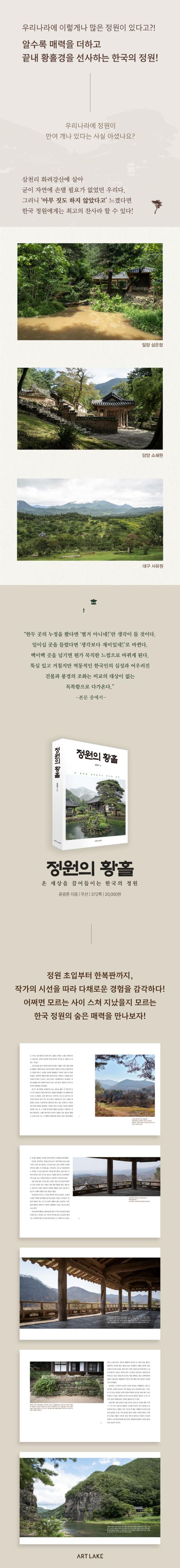 ¹Ì¼ú, À½¾Ç, °ÇÃà°ú µðÀÚÀÎ µî ¿¹¼úÀÇ ¾Æ¸§´Ù¿òÀ» »ç¶ûÇØ¼ Á÷Á¢ º¸°í µè°í Áñ±â´Â ÀÏÀ» À̾´Ù. Á¤¿øµµ ±× ¿¬Àå¼±¿¡ ÀÖ¾î¼ ±¹³»¿Ü Á¤¿øÀ» µÎ·ç ã¾Æ´Ù³æ´Ù. ¿ì¸® ¿¾ Á¤¿øÀÎ º°¼ÀÇ °¡Ä¡¸¦ »õ»ï ÁÖ¸ñÇØ¼ Àü±¹¿¡ Èð¾îÁø 200¿© °÷ÀÇ Á¤ÀÚ¿Í ´©°¢À» ´ä»çÇß´Ù. ¾î¶² °÷Àº ºÎ½ÇÇÑ °ü¸® »óÅ µîÀ¸·Î ÀÎÇØ ¼±ÛÇİú ¾Æ½¬¿òÀ¸·Î ³²¾Ò°í, ¶Ç ¾î¶² °÷Àº ¿¹»óÄ¡ ¸øÇÑ ±²ÀåÇÑ ¸Å·ÂÀ¸·Î ¿À°¨À» »ç·ÎÀâ¾Ò´Ù. ÀÌ·± ¼ø°£¼ø°£À» »çÁø°ú ÀλóÆò, ªÀº ÄÚ¸àÆ®·Î ±â·ÏÇØ¿Ô´Ù. ±×·¸°Ô ½×ÀÎ ±â·Ïµé °¡¿îµ¥ ƯÈ÷ °·ÄÇÑ ÀλóÀ» ³²±ä °÷µéÀ» Ãß·Á ´ã¹éÇÑ ¹®ÀåÀ¸·Î »ý»ýÇÏ°Ô Ç®¾î³Â´Ù. ÈíÀη °ÇÑ ±ÛÀ» µû¶ó°¡´Ù º¸¸é ¾î´À»õ °°Àº °ø°£À» º¸°í ´À³¢°í °Å´Ï´Â µíÇÑ ±âºÐÀÌ µç´Ù. ÀÛ°¡ ƯÀ¯ÀÇ °¨°¢À¸·Î ¤¾î³½ ¿ì¸® Á¤¿øÀÇ Æ¯»ö°ú ¸Å·ÂÀ» ´õ ¸¹Àº À̵é°ú ³ª´©°íÀÚ Ã¥À¸·Î Æì³½´Ù. ÁÖ¿ä Àú¼·Î´Â ¡¶¼Ò¸®ÀÇ È²È¦¡·, ¡¶Àß ÂïÀº »çÁø ÇÑ Àå¡·, ¡¶À±±¤ÁØÀÇ »ýȰ¸íǰ 101¡·, ¡¶½É¹Ì¾È ¼ö¾÷¡·, ¡¶³»°¡ »ç¶ûÇÑ °ø°£µé¡· µîÀÌ ÀÖ´Ù.