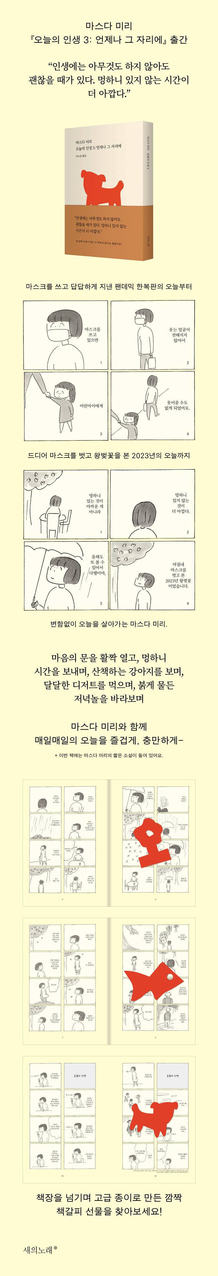 ÀÌ Ã¥Àº ÆÒµ¥¹Í ÇѺ¹ÆÇ¿¡ ÀÖ¾ú´ø 2020³âÀÇ ¿À´ÃºÎÅÍ ¸¶½ºÅ©¸¦ ¹þ°í ¿Õº¢²ÉÀ» º» 2023³âÀÇ ¿À´Ã¿¡ ´ëÇÑ À̾߱âÀÌ´Ù. Æò¹üÇÑ ¿À´ÃÀ» ±× ´©±¸º¸´Ù Ãæ½ÇÇÏ°Ô ¹Ù¶óº¸°í ´À³¢¸ç ±â·ÏÇØ¿Ô´ø ¸¶½º´Ù ¹Ì¸®°¡ ±×¸° ¡®½Ã½Ã°¢°¢ º¯ÈÇÏ´Â ¿À´ÃÀÇ Àλý¡¯À̾߸»·Î ¿ì¸®°¡ Áö±Ý ¸¸³ª¾ß ÇÏ´Â À̾߱âÀÏ °ÍÀÌ´Ù. ÀÌ Ã¥¿¡ ´ã±ä ¸¶½º´Ù ¹Ì¸®ÀÇ 4³âÀ» µû¶ó°¡´Ù º¸¸é, º¯È ¼Ó¿¡¼µµ ³ª´Ù¿î ¿À´ÃÀ» Â÷°îÂ÷°î ½×¾Æ¿Ã¸± ¶§ ÈûÀÌ »ý±ä´Ù°í ¸»ÇÏ´Â °Í¸¸ °°´Ù. ¸¶½º´Ù ¹Ì¸®ÀÇ ¡®¿À´Ã¡¯ÀÌ º¯ÇÔ¾øÀÌ ¿ì¸®¿¡°Ô ÇÊ¿äÇÑ ÀÌÀ¯´Ù.