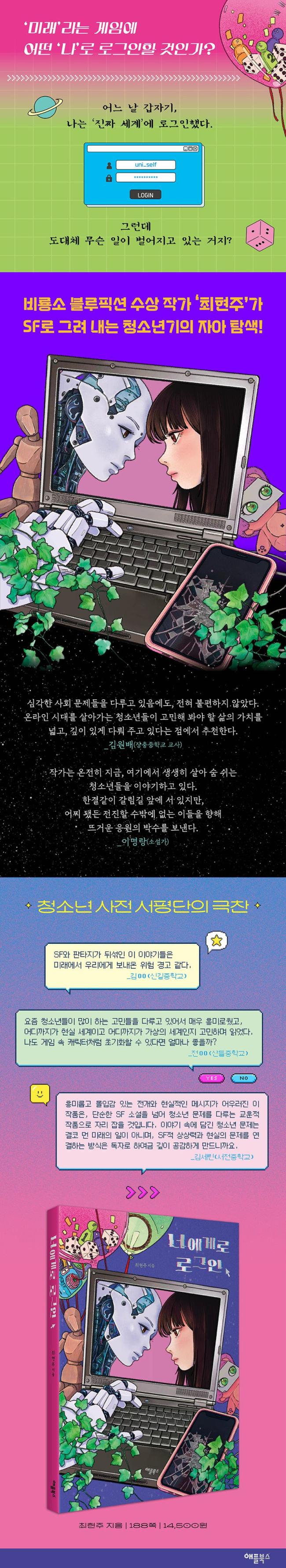ºñ·æ¼Ò ºí·çÇȼǻó ¼ö»óÀÚÀÎ ÃÖÇöÁÖ ÀÛ°¡ÀÇ SF û¼Ò³â ¾Ø¼Ö·ÎÁö ¡¶³Ê¿¡°Ô·Î ·Î±×ÀΡ·Àº »çÀ̹ö ºÒ¸µ, »çÇ༺ µµ¹Ú, µ¥ÀÌÆ® Æø·Â, Çб³ Æø·Â, Â÷º° µî Áö±Ý ¿ì¸® û¼Ò³âµéÀÌ ¸Â´Ú¶ß¸° »çȸ ¹®Á¦µéÀ» »À¾ÆÇÁ°Ô ±×·Á ³»°í ÀÖ´Ù. Àΰø Áö´ÉÀÇ ½Ã¼±¿¡¼ ¹Ù¶óº¸ÀÚ¸é, ÀÌ °°Àº ¹®Á¦¸¦ ÀÏÀ¸Å°´Â ¾ÆÀ̵éÀÌ ¡®¿À·ù¡¯ÀÏ ¼öµµ ÀÖÀ» °ÍÀÌ´Ù. ÇÏÁö¸¸ ¡¶³»ÀÏÀÇ »ýÁ¸±â¡·, ¡¶¿ë±âÀÇ ¾µ¸ð¡·(°øÀú) µî û¼Ò³âµéÀÌ ¸¶ÁÖÇØ¾ß ÇÒ »çȸ ¹®Á¦µéÀ» ½ºÅ丮ÅÚ¸µÀ¸·Î ²ÙÁØÈ÷ Ç®¾î¿Â ÀÛ°¡´Â ÀÌ ¾ÆÀ̵éÀ» Â÷°¡¿î ½Ã¼±À¸·Î ³»Ä¡Áö ¾Ê´Â´Ù. ¸Å À̾߱⠼ӿ¡¼ ¡®³ª¡¯´Â °è¼ÓÇØ¼ À߸øµÈ ¼±Åðú ½Ç¼ö¸¦ ¹Ýº¹ÇÏÁö¸¸, ½Ç¼öÇÑ µÚ¿¡ ÈÄȸÇÏ°í ¹Ý¼ºÇÏ´Â ¸ð½ÀÀ» º¸À̱⵵ ÇÑ´Ù. ¶§·Î´Â ¾ÆÇ »ç¶÷À» À§·ÎÇϰí, ¶Ç´Â À§·Î¹Þ´Â´Ù.