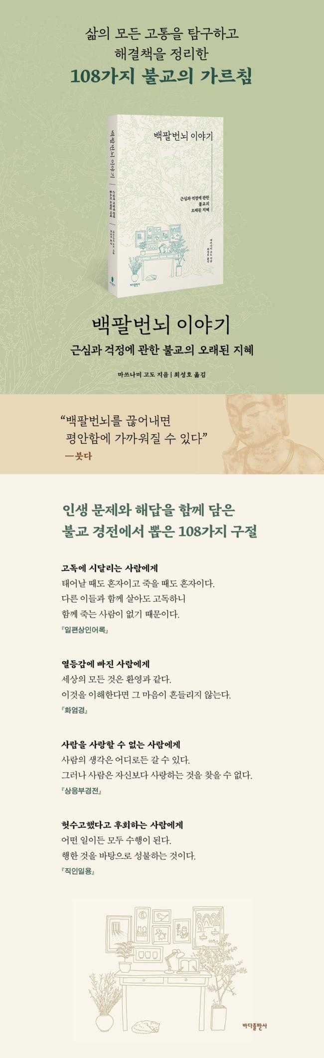 2500³â ÀüºÎÅÍ ÀüÇØ ³»·Á¿Â ºÒ±³ °æÀü ¼Ó ÁöÇý´Â ±í°í ¿À¹¦ÇÏ¿© ¿À´Ã³¯±îÁö ¸¹Àº ¸í¾ð°ú °¡¸£Ä§À¸·Î º¯Áֵǰí ÀÖ´Ù. ÀÌ Ã¥¿¡´Â ¼®°¡°¡ Á¦Àڵ鿡°Ô ¼³ÇÑ ÀλýÀÇ ±³ÈÆÀ» ¼®°¡ÀÇ ¾ð¾î·Î º¸Á¸ÇÑ ÃʱâºÒ±³ °æÀü ¡º»ç½ÊÀÌÀå°æ¡»°ú ¡º¹ý±¸°æ¡», ¡º°æÁý¡»°ú ºÎ¸ð¿Í ÀÚ½Ä, ½º½Â°ú Á¦ÀÚ µîÀÌ ÁöÄÑ¾ß ÇÒ ºÒ±³ÀÇ ¿¹¹ýÀ» ´ãÀº ¡ºÀ°¹æ¿¹°æ¡» µî 70¿© ±ÇÀÇ ºÒ°æ¿¡¼ ¼±º°µÈ 108°³ÀÇ ±¸ÀýÀÌ ¼ö·ÏµÇ¾î ÀÖ´Ù. ÀÌ ±¸ÀýµéÀº Àΰ£ÀÌ »ì¸é¼ °Þ°Ô µÇ´Â Á×À½°ú ³ëÈ, ºÒ¾È°ú ÁÂÀý µîÀÌ ÇÇÇÒ ¼ö ÀÖ´Â °ÍÀÌ ¾Æ´Ï¸ç, ¿ÀÈ÷·Á ¿ì¸®°¡ ºÒÇàÀÌ¶ó ¿©±â´Â À̰͵éÀÌ ¾ðÁ¦ ¾î¶² ¸ð½ÀÀ¸·Î ¿ì¸®¿¡°Ô ã¾Æ¿À´ÂÁö¸¦ ¹Ù·Î ¾Ë¸é ÃæºÐÈ÷ ´Ù½º·Á Æò¾ÈÇÑ ¸¶À½¿¡ À̸¦ ¼ö ÀÖ´Ù°í °¡¸£Ä¡°í ÀÖ´Ù. ¶ÇÇÑ ¿ì¸®°¡ »îÀ» »ì¾Æ°¡¸é¼ ÁöÄÑ¾ß ÇÒ µµ¸®¿Í ½º½º·Î »îÀÇ ±â»ÝÀ» ¸¸µå´Â ¹æ¹ý, ŸÀΰú ³ª ÀÚ½ÅÀ» ÀÌÇØÇÏ´Â ¹æ¹ý, Àΰ£°ü°èÀÇ °¥µî¿¡¼ ¹þ¾î³ª´Â ¹æ¹ý µîÀ» ´Ù·ç°í ÀÖ´Ù.