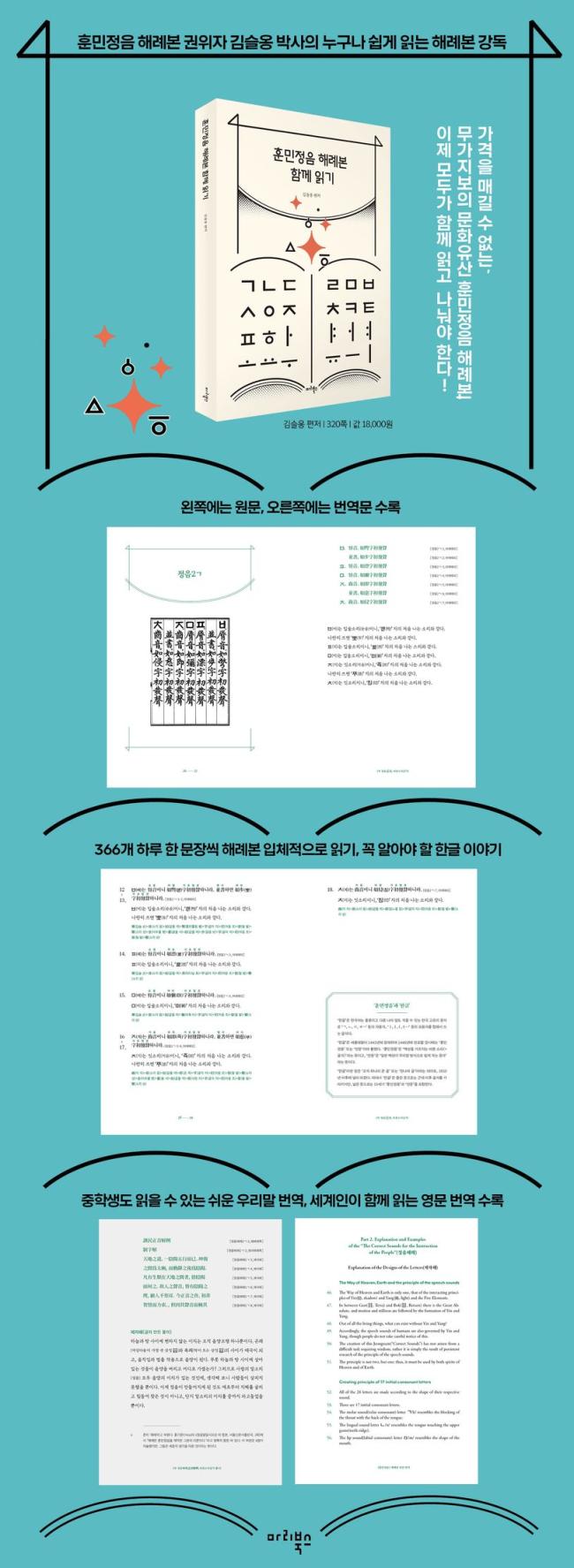 ¡¶ÈƹÎÁ¤À½ ÇØ·Êº» ÇÔ²² Àб⡷´Â ¿ø¹®°ú ¹ø¿ª¹®À» ÇÔ²² ¹èÄ¡ÇϵÇ, ¾î·Æ°Ô ´À²¸Áö´Â ¿ä¼Ò¸¦ ¹èÁ¦Çϰí, ¹ø¿ªµµ ÁßÇлý ÀÌ»ó ÀÐÀ» ¼ö ÀÖµµ·Ï ÃÖ´ëÇÑ ½±°Ô ÇϰíÀÚ Çß´Ù. ÀÌ·¸°Ô ÇØ·Êº»À» Àд µ¥ À庮ÀÌ µÇ´Â ¿ä¼ÒµéÀ» Á¦°ÅÇÏ¸é ±ÛÀÚ¸¦ ¸¸µç ¿ø¸®³ª ÇüŰ¡ ¸Å¿ì °úÇÐÀûÀ̰í, ¾î¶² ¹ßÀ½ÀÌµç ¸¶À½´ë·Î Ç¥ÇöÇÒ ¼ö ÀÖ´Ù´Â »ç½ÇÀ» ±ú´Ý°Ô µÈ´Ù. ½ÉÁö¾î ÈÆ¹ÎÁ¤À½À» ¸¸µç Èï¹ÌÁøÁøÇÑ ¹è°æ°ú °úÁ¤±îÁö, ¼¼Á¾ÀÇ Æø³ÐÀº »çÀ¯¿Í ÇØ·Êº»ÀÇ ±íÀº öÇеµ ´À³¥ ¼ö ÀÖ´Ù.