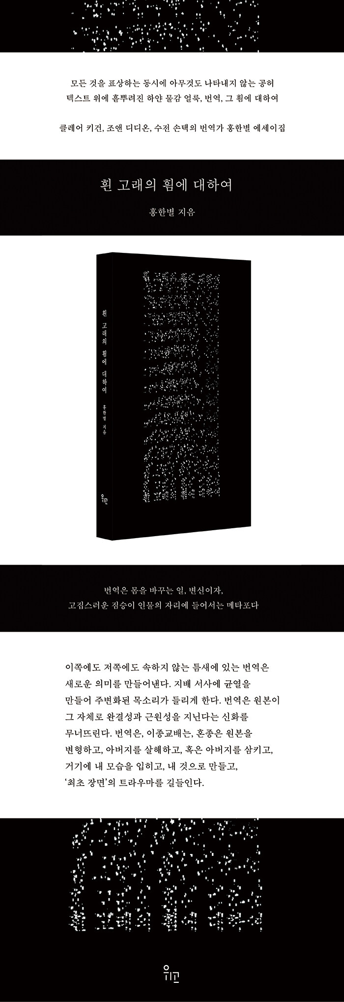Á¦¸ñÀÌ ¾Ï½ÃÇÏµí ¡ºÈò °í·¡ÀÇ Èô¿¡ ´ëÇÏ¿©¡»´Â ¹ø¿ª¿¡ ´ëÇÑ °Å´ëÇÑ ºñÀ¯´Ù. Çã¸Õ ¸áºôÀÌ °Å´ëÇÑ Èò °í·¡ÀÇ Á¸À縦 ±Ô¸íÇϱâ À§ÇØ ¡º¸ðºñ µñ¡»ÀÇ ÈÀÚ À̽´¸ÞÀÏÀÇ ÀÔÀ» ºô·Á ±×Åä·Ï ¹æ´ëÇÑ ¼»ç½Ã¸¦ ½á³Âµí È«ÇѺ° ¹ø¿ª°¡´Â ÀÌ Ã¥ÀÇ ¿³× Àå¿¡ °ÉÃÄ ³¡³» ¿Ï¼ºµÇÁö ¾ÊÀ» ¹ø¿ª¿¡ ´ëÇÑ ±ÛÀ» Ã¥Àå À§¿¡ ±×¸°´Ù.