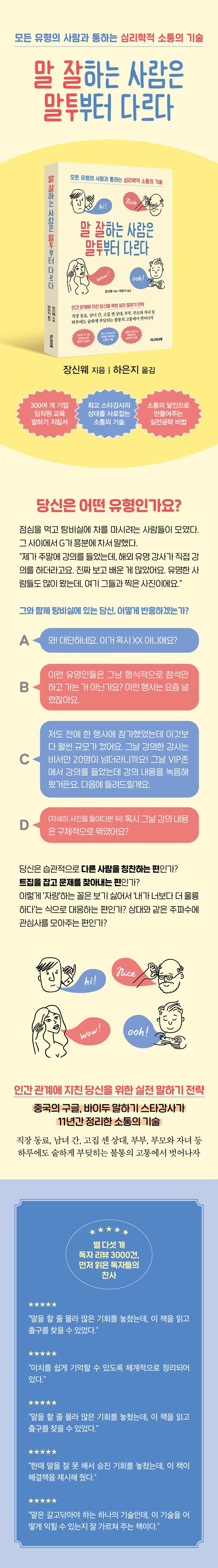 ¶ÇÇÑ ¼·Î ´Ù¸¥ À¯ÇüÀÇ »ç¶÷¿¡°Ô ¾î¶»°Ô °ø°¨ÇÏ°í °æÃ»Çϰí Á¢±ÙÇØ¾ß ÇÏ´ÂÁö¸¦ ¾Ë·ÁÁØ´Ù. ±ºµ¥±ºµ¥ ³ª´Â ¾î¶² À¯ÇüÀÎÁö ¾Ë¾Æº¸´Â Å×½ºÆ®µµ ¼ö·ÏµÇ¾î ÀÖ¾î ³»°¡ ¾î¶² »ç¶÷À̰í, ¾î¶»°Ô ¸»ÇÏ´ÂÁö¸¦ µ¹¾Æº¼ ¼ö ÀÖ´Ù. °¢ ÀåÀÇ ³¡ºÎºÐ¿¡ ¸¶·ÃµÈ ½ÇÀü ¿¬½À ³ëÆ®´Â ÀúÀÚÀÇ ¸»Çϱ⠺ñ¹ýÀ» ¼Õ½±°Ô ³» °ÍÀ¸·Î ¸¸µé¾î ¹Ù·Î Àû¿ëÇÒ ¼ö ÀÖ°Ô µµ¿ÍÁØ´Ù.