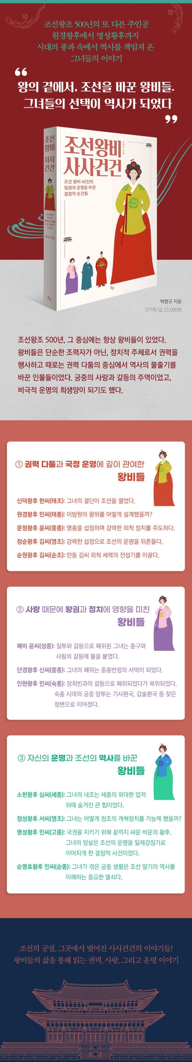 ¿Õºñ´Â ¡®¿ÕÀÇ ¾Æ³»¡¯ ±× ÀÌ»óÀ̾ú´Ù. ±×µéÀº °ü·á Áý´Ü, Áï ½ÅÇϸ¦ ´ëÇ¥ÇÏ¸ç ¿Õ°ú ÇÔ²² ½Ã´ë¸¦ À̲ø¾î ¿Â ¿ª»çÀÇ ÁÖü¿´´Ù. ¿Õ°ú ¿Õºñ´Â ¶§·Î´Â Á¤Ä¡Àû µ¿¹ÝÀÚ¿´°í, ¶§·Î´Â ´ë¸³°¢À» ¼¼¿î ä ÆØÆØÇÑ ±äÀå°¨ ¼Ó¿¡¼ Á¤ÀïÀ» Ä¡·¯¾ß Çß´ø ÀûÀ̾ú´Ù. ¿Õºñ´Â ¿ª»çÀÇ ÁÖÀΰøÀÌ µÉ ÀÚ°ÝÀÌ ÃæºÐÇÏ´Ù. ½Å°£ ¡¶Á¶¼±¿Õºñ »ç»ç°Ç°Ç¡·Àº ¿Õºñ¸¦ Á¶¼±»ç 500³âÀÇ Á¶¿¬ÀÌ ¾Æ´Ñ, ÁÖ¿¬À¸·Î ij½ºÆÃÇß´Ù. ÀÌ Ã¥¿¡¼´Â Á¶¼± ¿Õºñ 40¸íÀÌ ¿ª»ç¶ó´Â ¹«´ë¸¦ ¾î¶»°Ô Ȱº¸ÇØ ¿Ô´ÂÁö »ìÆìº¼ ¼ö ÀÖ´Ù. ±×µéÀÇ ±Ç·ÂÅõÀï, »ç¶û, ¾Öȯ, Èñ»ý°ú Á×À½±îÁö. ±×µéÀÇ ¿î¸í°ú ¿ª»ç¸¦ ¹Ù²Û °áÁ¤Àû »ç°ÇµéÀ» ¿ÕºñÀÇ ½Ã°¢¿¡¼ ÀçÁ¶¸íÇÑ´Ù.