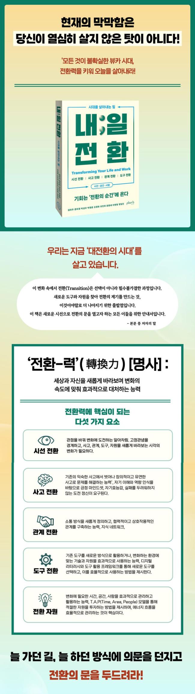 ÀüȯÀÌ ÇÊ¿äÇÏÁö ¾ÊÀº »ç¶÷Àº ¾ø´Ù. ȯ°æÀÌ ¹Ù²î°í, »îÀÇ ¸ñÇ¥°¡ ´Þ¶óÁö¸ç, ¿¹»óÄ¡ ¸øÇÑ µµÀü¿¡ ºÎµúÈú ¶§¸¶´Ù ¿ì¸®´Â ÀüȯÀÇ ¹®À» µÎµå¸°´Ù.