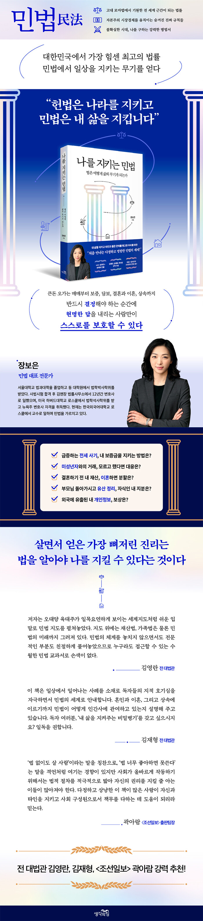 ±è¾ØÀå ¹ý·ü»ç¹«¼Ò¿¡¼ ÀÏÇÏ¸ç ¹Î¹ýÀÌ Àΰ£»ç¿¡ ¾î¶»°Ô °ü¿©ÇÏ´ÂÁö Àý½ÇÈ÷ ü°¨ÇÑ À庸Àº ±³¼ö´Â ´õ´Â ¹Î¹ýÀ» ¸ô¶ó ¾àÀÚ°¡ µÇ´Â À̵éÀÌ ¾ø±æ ¹Ù¶ó¸ç¡¶³ª¸¦ ÁöŰ´Â ¹Î¹ý¡·À» ½è´Ù. ÇØ¹æ ÀÌÈÄ ¿ì¸®³ª¶ó ¹Î¹ýÀÌ ½ÃÀÛÇÑ °¨µ¿ÀûÀÎ ¿ª»ç·Î ù ¼ö¾÷À» ¿¬ ÀúÀÚ´Â ¹Î¹ýÀ» ¶°¹ÞÄ¡´Â µÎ °³ÀÇ Å« ±âµÕ, Àç»ê¹ý°ú °¡Á·¹ý¿¡ ´ëÇØ 10°³ÀÇ ÇÙ½É °³³äÀ¸·Î ¼³¸íÇÑ´Ù. ³ª¾Æ°¡ ÃÖ±Ù ºÐÀïÀÌ ½Éȵǰí ÀÖ´Â AI °ü·Ã ¹Î¹ý µ¿Çâ°ú ¹Ì·¡±îÁö ´ã¾Ò´Ù. ¸¶Áö¸· ¼ö¾÷Àº °¨°Ü ÀÖ´Â ¡®¹ýÀÇ ´«¡¯À» ¶ß°í ³í¸®ÀûÀÎ ¡®¹ýÀÇ ¸Ó¸®¡¯·Î ¼¼»óÀ» ÀÌÇØÇÒ ¼ö ÀÖ´Â ÈÆ·Ã ´Ù¼¸ °¡Áö¸¦ üÈÇÏ´Â ½Ã°£ÀÌ´Ù. ¹ýÀÇ º¯µÎ¸®¿¡ ÀÖ´ø ´©±¸¶óµµ ÀÌ ¼ö¾÷À» ´Ù ¸¶Ä¡°í ³ª¸é ºÒÈ®½ÇÇÑ ½Ã´ë¸¦ µ¹ÆÄÇÏ´Â ÀλýÀÇ ¹«±â¸¦ ¾ò°Ô µÉ °ÍÀÌ´Ù.