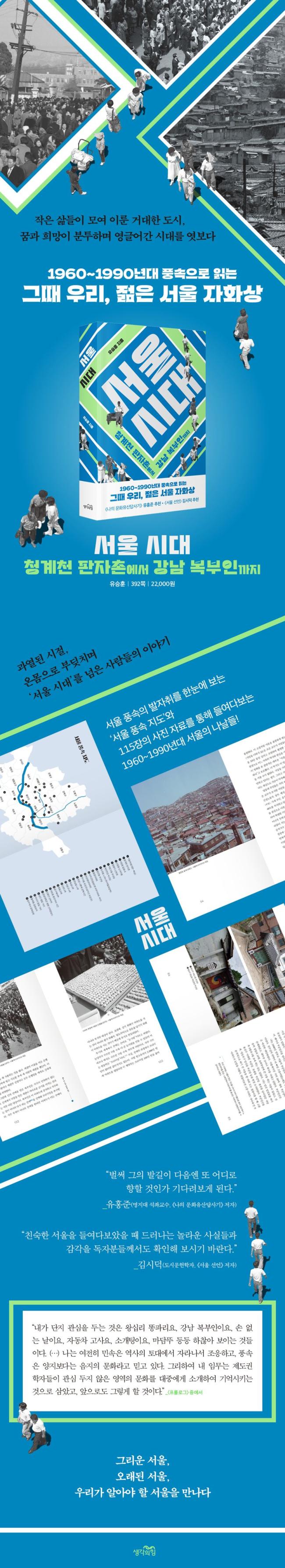 1960³â´ëºÎÅÍ 1990³â´ë, ´ëÇѹα¹ÀÌ ÀüÈÄÀÇ ÆóÇ㸦 µó°í ±Þ¼Óµµ·Î ¼ºÀåÇÑ ½Ã±â. ÀÌÃÌ Çâµµ¿Í »ê¾÷ÈÀÇ ¹°±æ ¼Ó¿¡ ÀÎÆÄ°¡ ¸ô·Áµé¸ç °ú°Å¿Í ÇöÀç, ³óÃ̰ú µµ½Ã°¡ µÚ¼¯À̸ç ÀÏ¾î³ ¼Ò¿ëµ¹ÀÌ¿¡¼´Â ÀÌ ½Ã´ë ƯÀ¯ÀÇ ¡®È¥Á¾ÀÇ Ç³¼Ó¡¯ÀÌ ³ªÅ¸³ª°í »ç¶óÁ®°¬´Ù. ÀÌ Ã¥ ¡¶¼¿ï ½Ã´ë¡·´Â 1960~1990³â´ë ¼¿ïÀÇ Ç³¼ÓÀ» »ìÆì ½Ã´ë¸¦ ÆÄÇìÄ¡°í, »ç¶÷À» ¸¶ÁÖÇÑ´Ù. »ê¾÷È¡¤µµ½ÃÈ ½Ã´ë¶ó´Â ½Ã°£ÀÌ ¼¿ïÀ̶ó´Â °ø°£°ú ¾î¶»°Ô Á¶ÀÀÇß³ª¸¦ ´ç½Ã »ç¶÷µéÀÇ »ýȰ»ó°ú dz¼ÓÀ̶ó´Â ÀÛ°í ±¸Ã¼ÀûÀÎ ´Ü¸éµé·Î µå·¯³½´Ù. ±¹°¡±â·Ï¿ø µî¿¡¼ º¸°üÇϰí ÀÖ´ø ºñ°ø°³ ÀÚ·á±îÁö Æ÷ÇÔÇÑ 115ÀåÀÇ »çÁø ÀÚ·á´Â ±×¶§ ±× ¼¿ïÀ» ´õ¿í »ý»ýÈ÷ ±×·Á³½´Ù. ¿ª»çÀÇ ¼ø°£À», ¼¿ïÀÇ ¼ºÀåÅë °¡µæÇÑ ¡®Ã»³â±â¡¯ÀÇ ¸é¸éÀ» Èï¹Ì·Ó°Ô »ìÇÇ´Ù º¸¸é ±×³¯ÀÇ Èñ¸ÁµéÀÌ ÇöÀçÀÇ ¿ì¸®¿¡°Ô ¼¼´ë ÀÌÇØ¿Í °ø°¨À̶ó´Â À¯»êÀ¸·Î µµÂøÇÒ °ÍÀÌ´Ù.
