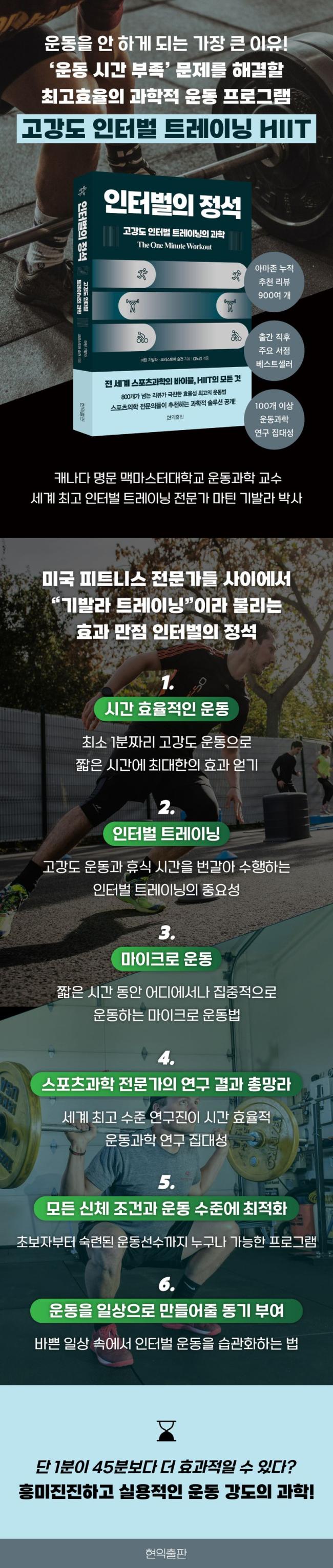 ÀúÀÚ°¡ ¼³¸íÇÏ´Â ¿©·¯ »ç·Ê´Â ¾ÆÁÖ Âª°í °µµ ³ôÀº ¿îµ¿ÀÌ °¡Àå È¿°úÀûÀÎ ¿îµ¿ ¹æ½ÄÀ̶ó´Â °ÍÀ» Áõ¸íÇÑ´Ù. ¶Ç °í°µµ ¿îµ¿Àº ¿îµ¿À» ÀßÇÏ´Â »ç¶÷µé¸¸ ÇÒ ¼ö ÀÖ´Ù´Â Åë³äÀ» ±ú°í, °µµ°¡ ½Ã°£º¸´Ù ´õ Áß¿äÇÏ´Ù´Â »ç½ÇÀ» ¹àÇô³½´Ù. µ¶ÀÚµéÀº °í°µµ ÀÎÅ͹ú Æ®·¹ÀÌ´×ÀÌ °¢Á¾ Áúº´À» ¿¹¹æÇÏ´Â °ÍÀº ¹°·Ð ü·ÂÀ» °ÈÇÏ´Â µ¥ ¾ó¸¶³ª ¾öû³ È¿°ú¸¦ ¹ßÈÖÇÏ´ÂÁö ÀÌÇØÇÏ°Ô µÉ °ÍÀÌ´Ù. ƯÈ÷ Æò¼Ò ¾É¾Æ ÀÖ´Â »ýȰÀ» ÇÏ´Â »ç¶÷µé ´ë´Ù¼ö°¡ ´Ü 3ºÐÀÇ °µµ ³ôÀº ¿îµ¿À» ÅëÇØ 150ºÐÀÇ Áö±¸·Â ¿îµ¿°ú °°Àº È¿°ú¸¦ ¾òÀ» ¼ö ÀÖ´Ù. ³ª¾Æ°¡, ÀÌ Ã¥Àº 8°¡Áö Á¾·ùÀÇ ÀÎÅ͹ú ¿îµ¿ ÇÁ·Î±×·¥°ú °³°³ÀÎÀÇ ´ÏÁî¿Í ¼±È£µµ¿¡ ÀûÇÕÇÑ 4°¡Áö ¿îµ¿¹ýµµ Á¦°øÇÏ¿© ¿©·¯ºÐÀÌ ¸Å¹ø Àü·ÂÀ» ´ÙÇÏÁö ¾Ê°íµµ È¿°úÀûÀ¸·Î ¿îµ¿ÇÒ ¼ö ÀÖµµ·Ï À̲ö´Ù. Àü ¼¼°è ¿îµ¿ Àü¹®°¡µé°ú ½ºÆ÷Ã÷ÀÇÇÐÀÚµéÀÌ ¸ÕÀú ÀÐ°í °·Â ÃßõÇÏ´Â ¿îµ¿ °úÇÐ ¿¬±¸ÀÇ Çʵ¶¼!