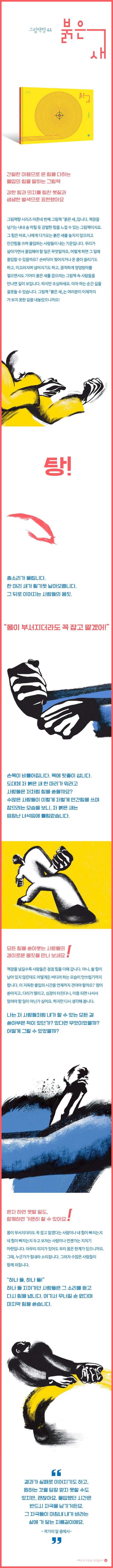 ±×¸²Ã¥Ç⠽ø®Áî ¸¶Èç³× ¹øÂ° ±×¸²Ã¥ ¡ººÓÀº »õ¡»ÀÔ´Ï´Ù. Ã¥ÀåÀ» ³Ñ±â´Â ³»³» ¼û ¸·Èú µí °·ÄÇÑ ÈûÀ» ´À³¥ ¼ö ÀÖ´Â ±×¸²Ã¥ÀÌÁö¿ä. ±× ÈûÀº ¹Ù·Î, ³ª¿¡°Ô ´Ù°¡¿À´Â ºÓÀº »õ¸¦ ³õÄ¡Áö ¾ÊÀ¸·Á°í ¾È°£ÈûÀ» ¾²¸ç ¸ôÀÔÇÏ´Â »ç¶÷µéÀÌ ³»´Â ±â¿îÀÔ´Ï´Ù. ¿ì¸®°¡ »ì¾Æ°¡¸é¼ ¸ôÀÔÇØ¾ß ÇÒ ÀÏÀº ¹«¾ùÀϱî¿ä, ¾î¶»°Ô ÇÏ¸é ±× ÀÏ¿¡ ¸ôÀÔÇÒ ¼ö ÀÖÀ»±î¿ä? ¼Õ¹Ù´ÚÀÌ Âõ¾îÁö°Å³ª ¿Â ¸öÀÌ ¾µ¸®±âµµ Çϰí, ¹Ì²ô·¯Áö¸ç ³Ñ¾îÁö±âµµ Çϰí, ÅÁ÷ÇÏ°Ô ¾ûµ¢¹æ¾Æ¸¦ ÂöÀ¸¸é¼µµ ±â¾îÀÌ ºÓÀº »õ¸¦ ÀâÀ¸·Á´Â ±×¸²Ã¥ ¼Ó »ç¶÷µéÀ» ¸¸³ª¸é ±æÀÌ º¸ÀÔ´Ï´Ù. ÇÏÁö¸¸ Á¶½ÉÇϼ¼¿ä. ¾ÆÂ÷ ÇÏ´Â ¼ø°£ ±æÀ» À߸øµé ¼ö ÀÖ½À´Ï´Ù. ±×¸²Ã¥ ¡ººÓÀº »õ¡»´Â ¿©·¯ºÐÀÌ ÀÌÁ¦±îÁö °¡ º¸Áö ¸øÇÑ ±æÀ» ³»³õ¾ÒÀ¸´Ï±î¿ä!