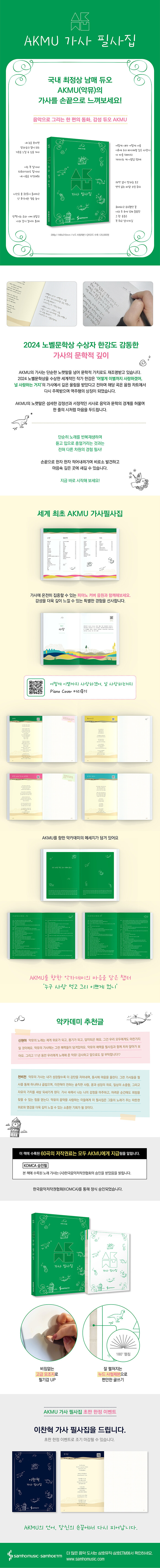 ±Û·Î ¾²´Â ³ë·¡ÀÇ ¿Â±â, AKMU °¡»ç ÇÊ»çÁý. AKMUÀÇ 60°îÀÌ ¼ö·ÏµÇ¾î ÀÖ´Ù. ƯÈ÷, ÇÊ»çÁý ¼Ó¿¡´Â AKMUÀÇ ÆÒ´ý ¡®¾ÇÄ«µ¥¹Ì¡¯°¡ Á÷Á¢ ÀÛ¼ºÇÑ ¸Þ½ÃÁöµµ ´ã°Ü ÀÖ´Ù. ÆÒµé°ú ¾ÆÆ¼½ºÆ®°¡ À½¾ÇÀ» ¸Å°³·Î ±³°¨ÇÏ¸ç ¸¸µé¾î³½ ÀÌ ±â·ÏÀº Ã¥À» ´õ¿í Ưº°ÇÏ°Ô ¸¸µç´Ù. Ã¥ ¼Ó QRÄڵ带 ½ºÄµÇϸé AKMU °îÀÇ ÇǾƳë Ä¿¹ö À½¿øÀ» µéÀ» ¼ö ÀÖ¾î, À½¾Ç°ú ÇÔ²²ÇÏ´Â ¸ôÀÔ°¨ ÀÖ´Â Çʻ簡 °¡´ÉÇÏ´Ù.