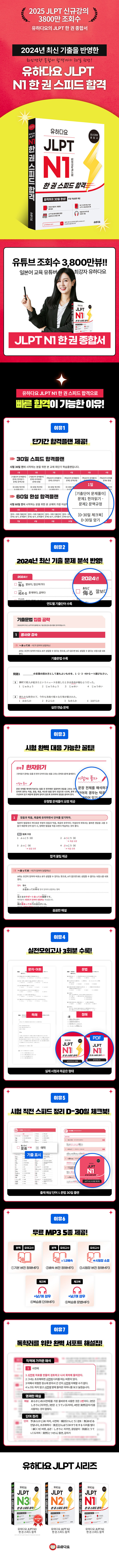 ÃֽŠÃâÁ¦ ¾îÈÖ¸¦ ¿¬µµº°·Î ¿Ïº® Á¤¸®ÇÏ¿´´Ù. °ú°Å ±âÃâ ¹®Á¦¸¦ öÀúÈ÷ ºÐ¼®ÇÏ¿© Á¤¸®ÇÑ [±âÃâ¹®¹ý]À» ¼ö·ÏÇÏ¿´´Ù. ´Ü±â°£ ÇÕ°ÝÀ» À§ÇÑ 30ÀÏ, 60ÀÏ ÇÕ°Ý Ç÷£À» Á¦°øÇÑ´Ù. µé°í ´Ù´Ï¸é¼ ÇнÀ °¡´ÉÇÑ JLPT N1 D-30ÀÏ Ã¼Å©ºÏÀ» ºÎ·ÏÀ¸·Î ±¸¼ºÇÏ¿´´Ù. Á¤´ä»Ó¸¸ ¾Æ´Ï¶ó ¿À´äÀÇ ÀÌÀ¯¸¦ ¸íÄèÇÏ°Ô Á¤¸®ÇÑ ÇØ¼³ÁýÀ» ¼ö·ÏÇÏ¿´´Ù. JLPTÃֽŠÃâÁ¦ °æÇâÀ» ¹Ý¿µÇÑ ½ÇÀü¸ðÀǰí»ç 3ȸºÐÀ» ¼ö·ÏÇÏ¿´´Ù. º¹½À¿ë ¹«·á MP3 5Á¾ ´Ù¿î·Îµå¸¦ Á¦°øÇÑ´Ù.