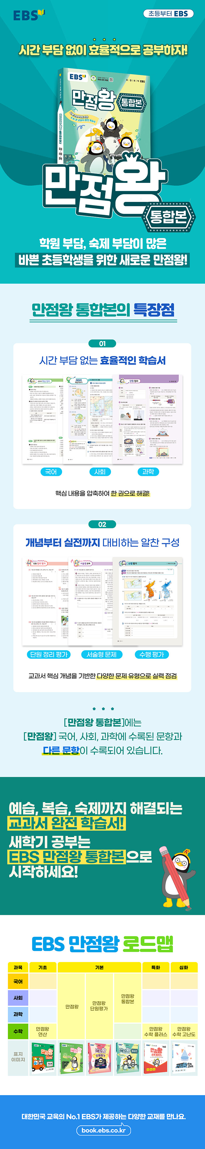 ±¹¾î, »çȸ, °úÇÐ ±³°ú¼ ÇÙ½É ³»¿ëÀ» ¾ÐÃàÀûÀ¸·Î Á¤¸®ÇÏ¿© ÇнÀ ºÎ´ã°ú ¼÷Á¦ ºÎ´ãÀÌ ¸¹Àº ÃʵîÇлýµµ ºü¸£°Ô ¸¸Á¡¿Õ ÇнÀÀÌ °¡´ÉÇÒ ¼ö ÀÖµµ·Ï ±¸¼ºÇÏ¿´´Ù. [±¹¾î], [»çȸ], [°úÇÐ] °³³äºÏÀ¸·Î ±³°ú¼ °³³äÀ» ÇнÀÇÏ°í ½ÇÀü ¹®Á¦·Î ±³°ú ÇнÀÀ» ¿Ïº®ÇÏ°Ô ÀÌÇØÇÒ ¼ö ÀÖ´Ù.
