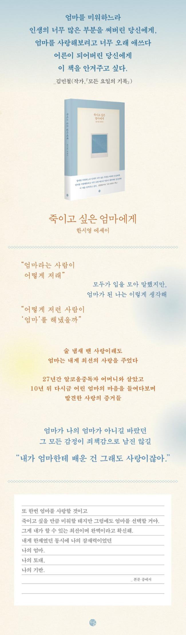 ÀúÀÚ´Â ¡ºÁ×ÀÌ°í ½ÍÀº ¾ö¸¶¿¡°Ô¡»¸¦ ÅëÇØ ¼ú ³¿»õ ³ª´Â ½Ã°£µéÀ» ¿ë°¨ÇÏ°Ô Ç®¾îÇìÃÆ´Ù. ±×·¯°í´Â ¸Ó¸®¸¦ ¶¦¾ÆÁÖ´ø ¾ö¸¶ÀÇ ¼Õ±æ¿¡¼, ±×³à°¡ Åð±Ù±æ¿¡ »ç¿Â ¶ß°Å¿î ġŲºÀÅõ¿¡¼, ±×³à°¡ Á¢¾îÁØ Àü±³ÀÓ¿ø¼±°Å ¡®Ã⸶ÀÇ º¯¡¯ ÀüÁö¿¡¼, ±×¸®°í ¹Ìó µþÀÎ ÀÚ½ÅÁ¶Â÷ Àذí ÀÖ´ø ¸ðµç ¼ø°£¿¡ ºÐ¸íÈ÷ ÀÚ¸®Çß´ø »ç¶ûÀ» ã¾Æ³½´Ù. ´©±¸¿¡°Ô³ª ¡°¾î¶² ÇüÅÂÀÇ µ¹º½ÀÌ µÇ¾úµç ³ª¸¦ Ű¿ö³½ ¾ö¸¶¡±°¡ ÀÖ´Ù. ¾ö¸¶¸¦ Á×ÀÏ µíÀÌ ¹Ì¿öÇØº¸°í, ¶Ç ´©±¸º¸´Ùµµ ¼º½ÇÈ÷ »ç¶ûÇØº» ¿ì¸® ¸ðµÎ´Â ÀÌ Ã¥¿¡¼ °á±¹ »ç¶ûÀÇ Áõ°Å¸¦ ¹ß°ßÇÏ°Ô µÉ °ÍÀÌ´Ù.