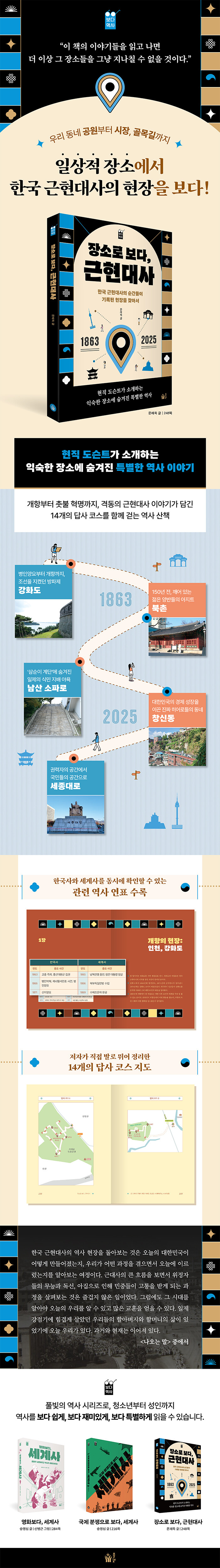 ¡¶Àå¼Ò·Î º¸´Ù, ±ÙÇö´ë»ç¡·´Â ¿ì¸® °çÀÇ Àå¼Òµé¿¡¼ ¿ª»çÀÇ ÈçÀûÀ» ã¾Æ À̾߱⸦ Ç®¾î³½ ÀÏÁ¾ÀÇ ´ä»ç±âÀÌ´Ù. ¼´ë¹®Çü¹«¼Ò µî ¿ª»ç ÇöÀå¿¡¼ µµ½¼Æ®·Î Ȱµ¿Çϰí ÀÖ´Â ÀúÀÚ´Â Çѱ¹ ±ÙÇö´ë»çÀÇ ÁÖ¿ä »ç°ÇµéÀÌ ÀÏ¾î³ ¼¿ï°ú °æ±âµµ Àϴ븦 ¹«´ë·Î »ï¾Æ 14°³ÀÇ ¿ª»ç ´ä»ç ÄÚ½º¸¦ ²Ù·Á ³Â´Ù. µµ½¼Æ®·Î¼ÀÇ ´É·ÂÀ» ¹ßÈÖÇØ ²Ä²ÄÇÏ°í ¾ËÂ÷°Ô § ÄÚ½ºµéÀº Áö·çÇÒ Æ´ ¾øÀÌ Èï¹Ì·Ó´Ù. °³Ç׺ÎÅÍ ÀÏÁ¦°Á¡±â, µ¶¸³¿îµ¿°ú »ê¾÷È ½Ã±â, ¹ÎÁÖÈ ¿îµ¿À» °ÅÃÄ ¿À´Ã³¯ÀÇ ¹ÎÁÖÁÖÀDZîÁö ¿ì¸® ±ÙÇö´ë»ç ¼Ó °Ýµ¿ÀÇ ¼ø°£µéÀ» ´ãÀº Àå¼ÒµéÀ» Á÷Á¢ ã¾Æ´Ù´Ï¸ç »çÁøÀ» Âï°í, ¿ª»ç¸¦ ÀÌ¾î °¢°¢ÀÇ ÄÚ½º·Î ¸¸µé¾ú´Ù. Ã¥À¸·Î³ª¸¶ µ¶ÀÚµéÀÌ »ý»ýÇÑ ¿ª»çÀÇ ÇöÀå ¼ÓÀ¸·Î µé¾î°¡ ¿ª»ç¸¦ Á¦´ë·Î ¾Ë°í ´À³¥ ¼ö Àֱ⸦ ¹Ù¶ó´Â ¸¶À½ÀÌ´Ù.