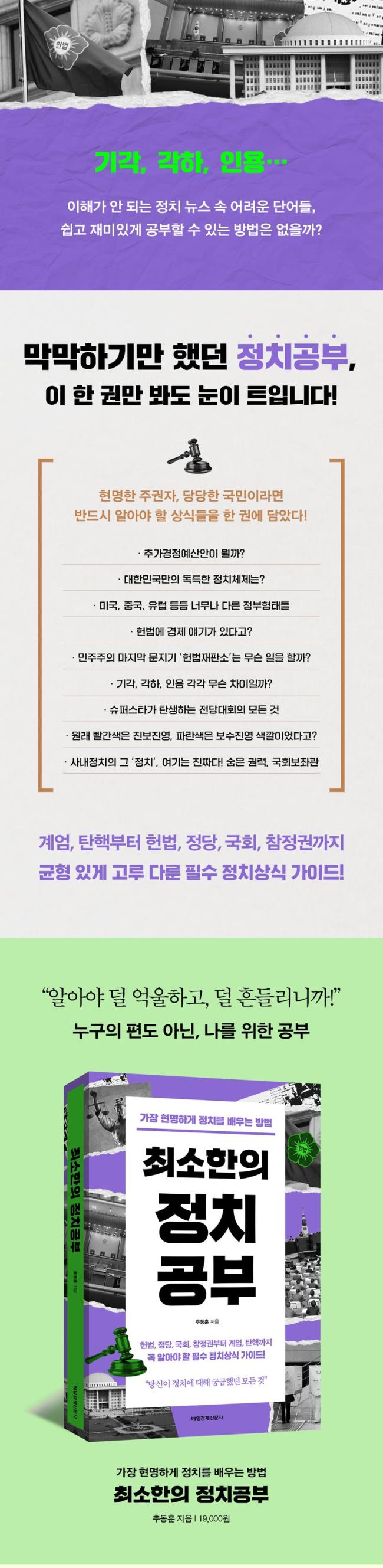¡¶ÃÖ¼ÒÇÑÀÇ Á¤Ä¡°øºÎ¡·´Â ±¹È¸¿¡ ´Ù³â°£ ÃâÀÔÇß´ø Á¤Ä¡ºÎ ±âÀÚ Ãâ½Å Ãßµ¿ÈÆ ÀúÀÚ°¡ »ýµ¿°¨ ³ÑÄ¡´Â Á¤Ä¡¸¦ ½±°í Àç¹ÌÀÖ°Ô ´ã¾Æ³½ Ã¥ÀÌ´Ù. ¹Ù»Û »î ÇѰ¡¿îµ¥, ³ªÀÇ ±Ç¸®¸¦ ÁöÄѳ»±â À§Çؼ ²À ¾Ë¾Æ¾ß ÇÒ Á¤Ä¡»ó½ÄÀ» ¾ö¼±ÇØ ¸ðµÎ ´ã¾Ò´Ù. ÃÊÆÇ ÇÑÁ¤ º°Ã¥ºÎ·ÏÀ¸·Î ´ëÇѹα¹À» ²Ù¸®´Â ±âº» ¿ø¸®, ¡¶´ëÇѹα¹ Çå¹ý¡·µµ ÇÔ²² ÁõÁ¤ÇÑ´Ù.