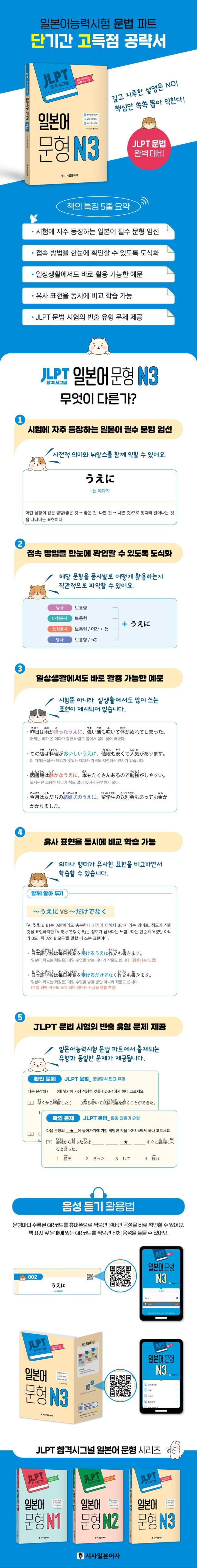 ÀϺ»¾î´É·Â½ÃÇè(JLPT)ÀÇ ¹®¹ý ¹®Á¦¸¦ Ç®±â À§ÇØ ÇʼöÀûÀ¸·Î ¾Ë¾Æ¾ß ÇÒ ¹®ÇüÀ» ¼ö·ÏÇÑ ±³ÀçÀÌ´Ù. ǰ»çº°·Î ´Ù¾çÇÑ ¿¹¹®ÀÌ Á¦½ÃµÇ¾î ÀÖ°í, ÀÇ¹Ì¿Í ÇüŰ¡ À¯»çÇÑ ¹®ÇüµéÀ» ÇÔ²² ÀÍÈú ¼ö ÀÖ¾î È¿°úÀûÀ̰í ü°èÀûÀÎ ÇнÀÀÌ °¡´ÉÇÏ´Ù.