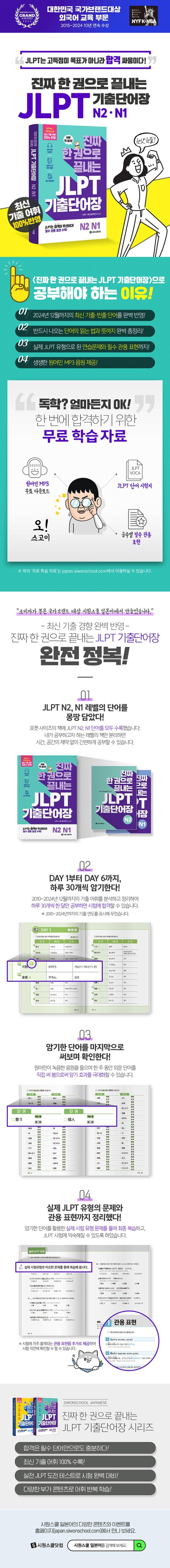 ¡ºÁøÂ¥ ÇÑ ±ÇÀ¸·Î ³¡³»´Â JLPT ±âÃâ´Ü¾îÀå N2¤ýN1¡»Àº 2010³âºÎÅÍ 2024³â 12¿ù±îÁöÀÇ ±âÃâ ¾îÈÖ¸¦ ºÐ¼®ÇÑ ÈÄ N2 ´Ü¾îºÎÅÍ N1 ´Ü¾î±îÁö ÇÑ ¹ø¿¡ ÇнÀÇÒ ¼ö ÀÖµµ·Ï ±¸¼ºÇÑ ´Ü¾îÀåÀÔ´Ï´Ù. JLPT ½ÃÇè¿¡¼ ²À ÃâÁ¦µÇ´Â ±âÃâ ´Ü¾î ¾à 1,440°³¸¦ ¼ö·ÏÇÏ¿´À¸¸ç, ¡®½Ç·Â üũ ¡æ ½ÇÀü JLPT µµÀü¡¯À¸·Î ±¸¼ºµÈ 2´Ü°è Å×½ºÆ®¸¦ ÅëÇØ ½Ã¿ø½ºÄð¸¸ÀÇ ÀÚµ¿ ¾Ï±â ³ëÇϿ츦 Àü¼öÇÕ´Ï´Ù. ƯÈ÷, ½ÇÀü JLPT µµÀü ÆÄÆ®ÀÇ °æ¿ì, ½ÇÁ¦ JLPT ½ÃÇè À¯ÇüÀ¸·Î ¹®Á¦¸¦ ±¸¼ºÇÏ¿© JLPT ½ÃÇè¿¡ È®½ÇÇÏ°Ô ´ëºñÇÒ ¼ö ÀÖ½À´Ï´Ù.