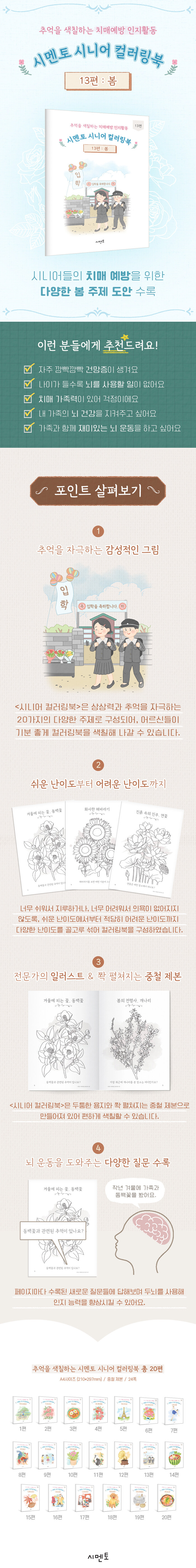 ÇູÇÏ°í °Ç°ÇÑ ³ë³â±â¸¦ À§ÇØ ½Ã´Ï¾îµéÀÇ Ä¡¸Å ¿¹¹æÀ» µ½´Â Ä÷¯¸µºÏÀÌ´Ù. »ó»ó·Â°ú Ãß¾ïÀ» ÀÚ±ØÇÏ´Â 20°¡ÁöÀÇ ´Ù¾çÇÑ ÁÖÁ¦·Î ±¸¼ºµÇ¾î ¾î¸£½ÅµéÀÌ ±âºÐ ÁÁ°Ô Ä÷¯¸µºÏÀ» »öÄ¥ÇØ ³ª°¥ ¼ö ÀÖ´Ù. ¶ÇÇÑ ÆäÀÌÁö¸¶´Ù ¼ö·ÏµÈ ´Ù¾çÇÑ Áú¹®À» ÅëÇØ ³ú ¿îµ¿À» µµ¿Í ÀÎÁö ´É·ÂÀ» Çâ»ó½Ãų ¼ö ÀÖµµ·Ï ÇÏ¿´´Ù.
