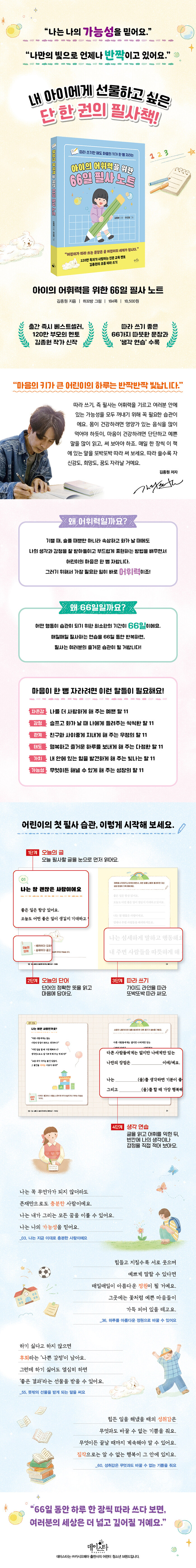 ¡¶±èÁ¾¿øÀÇ Ãʵî ÇÊ»ç ÀÏ·Â 365¡·¸¦ ÅëÇØ ƯÀ¯ÀÇ ¼¶¼¼ÇÏ°í µû¶æÇÑ °¨¼º°ú Àι®ÇÐÀû ½Ã¼±ÀÌ ´ã±ä ¹®ÀåÀ¸·Î ¾î¸°ÀÌÀÇ ÇÊ»ç ½À°üÀ» Àâ´Â µ¥¿¡ Å« µµ¿òÀ» ÁÖ¾ú´ø ±èÁ¾¿ø ÀÛ°¡°¡ À̹ø¿¡´Â ¡¶¾ÆÀÌÀÇ ¾îÈÖ·ÂÀ» À§ÇÑ 66ÀÏ ÇÊ»ç ³ëÆ®¡··Î µ¹¾Æ¿Ô½À´Ï´Ù. ¾ÆÀ̵éÀÌ ÀڽŸ¸ÀÇ ¼ºÀåÀÇ ¾¾¾Ñ¿¡ ¹°À» ÁÖ°í ¿òÀ» Æ·¿ï ¼ö ÀÖµµ·Ï ÀÚÁ¸°¨, °¨Á¤, °ü°è, ŵµ, °¡Ä¡, °¡´É¼ºÀÇ ¸» 66°¡Áö¸¦ ¸ð¾Ò½À´Ï´Ù. ÁÖ¾îÁø ¹®ÀåÀ» µû¶ó ¾²±â¸¸ ÇÏ´Â °ÍÀÌ ¾Æ´Ï¶ó, µû¶ó ¾²±â¸¦ ÇÏ¸ç ¾îÈÖ·ÂÀ» Ű¿ï ¼ö ÀÖµµ·Ï ±Û¸¶´Ù °¡Àå Áß¿äÇÏ°Ô »ý°¢ÇÏ´Â ´Ü¾î¸¦ ²Å¾Æ »çÀüÀû Àǹ̵µ Á¤¸®ÇØ µÎ¾ú½À´Ï´Ù. ¡®66ÀÏ¡¯À̶ó´Â ±â°£Àº ¾î¶² ÇൿÀÌ ÇÑ »ç¶÷ÀÇ ½À°üÀ¸·Î ÀÚ¸® Àâ±â À§ÇØ ¼Ò¿äµÇ´Â ÃÖ¼ÒÇÑÀÇ ½Ã°£À¸·Î, ±×µ¿¾È ¸ÅÀÏ Çʻ縦 ¹Ýº¹ÇÔÀ¸·Î½á ¾ÆÀ̵éÀÌ Çʻ縦 Áñ°Å¿î ½À°üÀ¸·Î ¿©±â°Ô µÇ±â¸¦ ¹Ù¶ó´Â ¸¶À½À» ´ã¾Ò½À´Ï´Ù.