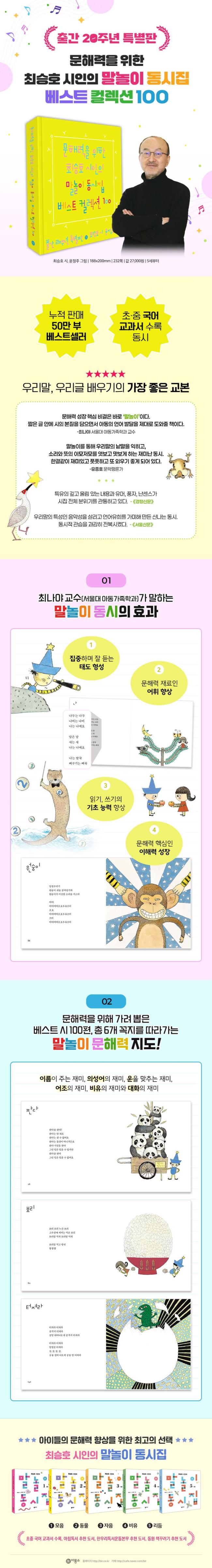 20ÁÖ³â Æ¯º°ÆÇÀº ¡¸ÃÖ½ÂÈ£ ½ÃÀÎÀÇ ¸»³îÀÌ µ¿½ÃÁý¡¹ ½Ã¸®Áî(5±Ç)¿¡ ½Ç¸° ¸»³îÀÌ µ¿½Ã¸¦ ÃÑ 6°³·Î ºÐ·ùÇØ ¾ÆÀ̵éÀÇ ¹®ÇØ·Â Áöµµ¸¦ ¿Ï¼ºÇß´Ù. À̸§ÀÌ ÁÖ´Â Àç¹Ì, ÀǼº¾îÀÇ Àç¹Ì, ¿îÀ» ¸ÂÃß´Â Àç¹Ì, ¾îÁ¶ÀÇ Àç¹Ì, ºñÀ¯ÀÇ Àç¹Ì¿Í ´ëÈÀÇ Àç¹Ì·Î ³ª´©¾î ¾ÆÀ̵éÀÌ ¸»³îÀÌÀÇ ´Ù¾çÇÑ Àç¹Ì¿¡ Èì»¶ ºüÁ® º¼ ¼ö ÀÖµµ·Ï ÇÑ´Ù. ²ô´ö»õ¿ì, ¾²¸£¶ó¹Ì, ³ª³ª´Ï¹ú, ÅåÅä±â, ³î·¡¹Ì µî À̸§ ÀÚü°¡ ºÒ·¯¿À´Â È£±â½É°ú À̸§À¸·Î Ǫ´Â ½ÃÀû Ç¥ÇöÀ» ÅëÇØ ¸Ó¸´¼Ó¿¡ ´Ù¾çÇÑ À̹ÌÁö¸¦ ±×·Á º¼ ¼ö ÀÖ´Ù. ¶Ç ¿ì¸®¸»ÀÇ ´Ù¾çÇÑ ÀǼº¾î¸¦ Á¢ÇÒ ¼ö Àִ°¡ Çϸé, ¿î°ú ¾îÁ¶¸¦ ¸ÂÃß¸é¼ ¸»ÀÇ ¸Ú°ú ¸ÀÀ» ´À²¸ º¼ ¼ö ÀÖ´Ù. ºñÀ¯¸¦ ÅëÇØ ±× Àǹ̸¦ ´Ù¾çÇÏ°Ô ÇØ¼®ÇÒ ¼ö ÀÖµµ·Ï Çϸç, ´ëÈ·Î Ç®¾î³½ ½Ã¸¦ ÅëÇØ¼´Â »óÈ£Àû °ü°è¿Í ¹®¸Æ ¼Ó¿¡¼ ±× ¶æÀ» ÀÌÇØÇÒ ¼ö ÀÖµµ·Ï ÇÑ´Ù. ƯÈ÷ À¯ÄèÇϸ鼵µ ¼¶¼¼ÇÑ À±Á¤ÁÖÀÇ ±×¸²Àº ½ÃÀû Àǹ̸¦ ´õ¿í È®ÀåÇØ ÁÖ¸ç, ÀÔüÀûÀÌ°íµµ ¾û¶×ÇÑ »ó»óÀ» ÇÒ ¼ö ÀÖµµ·Ï µ½´Â´Ù.