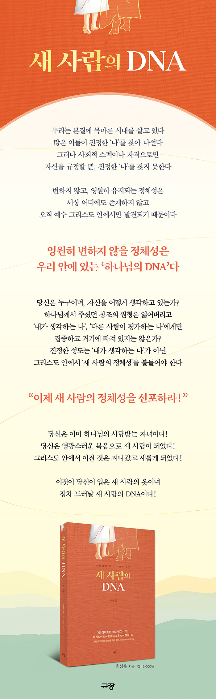 ¿ì¸® ÀλýÀÇ °¡Àå È®½ÇÇÑ º¯ÈÀÇ ÅÍ´× Æ÷ÀÎÆ®, ½Å¾Ó»ýȰÀÇ Ãâ¹ßÁ¡Àº ³ªÀÇ ¾Æ¹öÁö°¡ Çϳª´ÔÀ̽ðí, ³ª´Â ±×ºÐÀÇ ÀÚ³à¶ó´Â ¸íÈ®ÇÑ ÀÚ±â Á¤Ã¼¼ºÀ» ÀνÄÇÏ°í ¹Ï´Â °ÍºÎÅÍÀÌ´Ù. Çϳª´ÔÀº ÀÚ½ÅÀÇ Àڳడ Çϳª´ÔÀÇ Çü»ó(Çϳª´ÔÀÇ ±Ç¼¼, ´É·Â, ¼ºÇ°)°ú ¾Æ¹öÁö°¡ Àڳ࿡°Ô ÁØ Æ¯±Ç(±âµµ, ±³Á¦, »õ ¿µ, »ó¼ÓÀÚ)À» ¸¶À½²¯ ´©¸®¸é¼ º¯È¿Í ¼ºÀå, ±×¸®°í ´É·Â ÀÖ´Â »îÀ» »ì¾Æ°¡±â¸¦ ¿øÇϽŴÙ. ÀúÀÚ ¿ª½Ã µ¿ÀÏÇÑ ¾Æ¹öÁöÀÇ ¸¶À½À¸·Î ´õ ¸¹Àº ¿µÈ¥µé¿¡°Ô »õ »ç¶÷ÀÇ Á¤Ã¼¼ºÀ» ¾Ë¸®±â À§ÇØ ¡®»õ »ç¶÷ÀÇ DNA¡¯¸¦ °¡¸£Ä¡¸ç ÀüÇϰí ÀÖ´Ù. ÀÌ Ã¥Àº ¡®»õ »ç¶÷ÀÇ DNA¡¯(DNA Of A New Man)¸¦ ÅëÇØ ½ÅºÐÀÌ º¯ÇÑ ±×¸®½ºµµÀÎÀÌ ±×¸®½ºµµÀÇ À强ÇÑ ºÐ·®±îÁö ³¯¸¶´Ù ¼ºÀåÇÒ ¼ö ÀÖµµ·Ï ÇÏ´Â Èû°ú ¹æÇâÀ» ±¸Ã¼ÀûÀ¸·Î ¾È³»ÇØÁØ´Ù. ÁøÁ¤ÇÑ ¼ºµµ´Â ¡®³»°¡ »ý°¢ÇÏ´Â ³ª¡¯, ¡®´Ù¸¥ »ç¶÷µéÀÌ Æò°¡ÇÏ´Â ³ª¡¯¿¡°Ô ÁýÁßÇÏ´Â °ÍÀÌ ¾Æ´Ï¶ó ¡®±×¸®½ºµµ ¾È¿¡ ÀÖ´Â ³ª¡¯, ¡®»õ »ç¶÷ÀÇ Á¤Ã¼¼º¡¯À» ºÙµå´Â »ç¶÷À̱⠶§¹®ÀÌ´Ù.