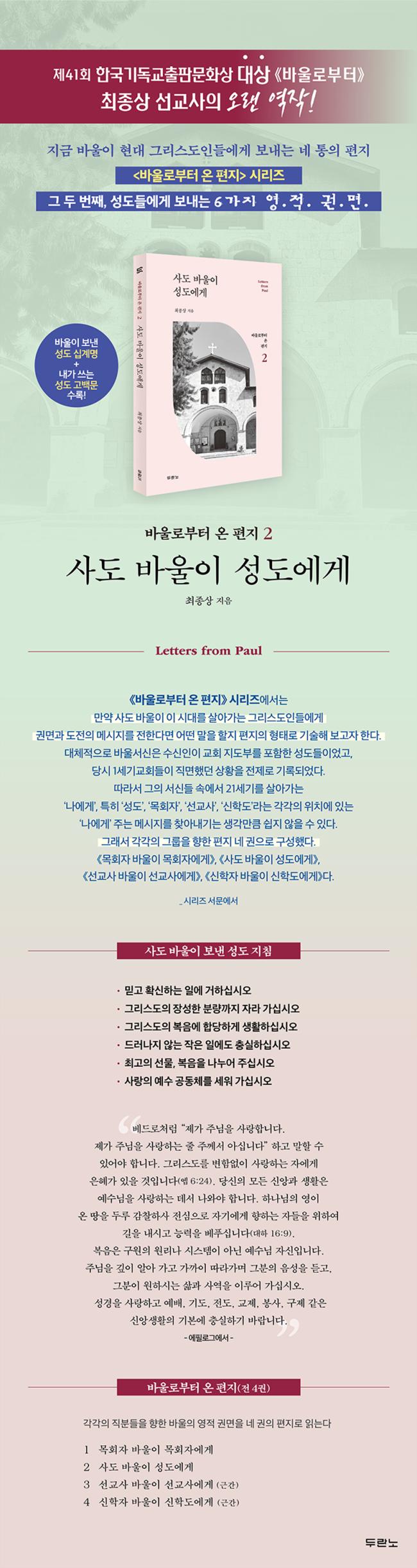 ÀÌ Ã¥Àº ÀÌ·¯ÇÑ ¸Æ¶ô¿¡¼, ÀúÀÚ¿¡°Ô´Â ¹Ù¿ïÀ̶ó´Â ÇÑ Àι°À» ºÎ°¢Çϱ⺸´Ù, Áö±Ý ÀÌ ½Ã´ë¿¡ ¹Ù¿ïÀÌ ³²±ä ¼½Å°ú ±× ¸Þ½ÃÁö¸¦ ÅëÇØ º¹À½ Àüµµ¿Í ±×¸®½ºµµÀÎÀ¸·Î¼ÀÇ »ç¸íÀ» ºÎ°¢ÇÏ·Á ÇÑ´Ù. ÀúÀÚ´Â ¹Ù¿ï ¼½ÅÀ» ÃÑ 4±ÇÀÇ Ã¥À¸·Î ÁýÇÊ ÇÒ ¿¹Á¤Àε¥, ÀÌ Ã¥Àº ±× µÎ ¹øÂ° À̾߱â·Î ¡¶¸ñȸÀÚ ¹Ù¿ïÀÌ ¸ñȸÀÚ¿¡°Ô¡·¿¡ À̾î ÀÌ ½Ã´ë¸¦ »ì¾Æ°¡´Â ¼ºµµµéÀ» ÇâÇÑ ¹Ù¿ïÀÇ µû¶æÇÑ ¾ÖÁ¤°ú °£ÀýÇÑ È£¼Ò·Î °¡µæÇÏ´Ù. ÃÑ 6°¡ÁöÀÇ ±Ç¸éÀ¸·Î ÀÌ·ç¾îÁø º»¼¿¡¼ ¹Ù¿ïÀº ÀÚ½ÅÀÌ ¼¼¿î ±³È¸¿Í ¼ºµµµé¿¡°Ô °¢°¢ÀÇ ÇüÆí°ú »óȲ¿¡ µû¶ó ±×¿¡ ²À ÇÊ¿äÇÑ ±Ç¸é°ú ´çºÎ¸¦ ÀüÇϰí ÀÖÀ¸¸ç, ÀÌ´Â ¿À´Ã³¯ ¼ºµµµéÀÇ »î°ú ½Å¾ÓÀÇ ±ÕÇüÀ» ÀÌ·ç´Âµ¥µµ ²À ÇÊ¿äÇÑ ³»¿ëµéÀ̶ó°í ÇÒ ¼ö ÀÖ´Ù. ¶ÇÇÑ ÀüÀÛ°ú ¸¶Âù°¡Áö·Î ¡®¹¬»ó°ú ³ª´®¡¯À» Á¦°øÇØ °øµ¿Ã¼ ³» ¼Ò±×·ì¸ðÀÓ¿¡¼ÀÇ È°¿ëÀÌ ¿ëÀÌÇϸç, ¡®¹Ù¿ïÀÌ º¸³½ ¼ºµµ ½Ê°è¸í¡¯À» ÅëÇØ ´Ù½Ã ÇÑ ¹ø ¼ºµµ·Î¼ ¹ÏÀ½ÀÇ ´ÙÁüÀ» ÇÏ°í ¡®³»°¡ ¾²´Â ¼ºµµ °í¹é¹®¡¯À» ÀÛ¼ºÇÒ ¼ö ÀÖµµ·Ï ÇÑ´Ù.