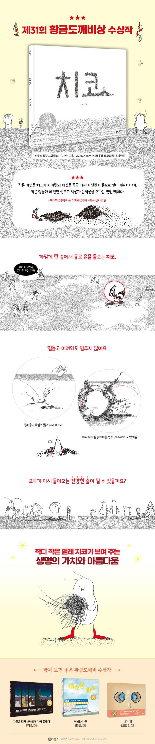 Á¦31ȸ ºñ·æ¼Ò Ȳ±Ýµµ±úºñ»ó ¼ö»óÀÛ ¡ºÄ¡ÄÚ¡»°¡ ¢ßºñ·æ¼Ò¿¡¼ Ãâ°£µÇ¾ú´Ù. Ȳ±Ýµµ±úºñ»óÀº 1992³â ±¹³» ¾î¸°ÀÌ ¹®Çаè ÃÖÃÊ·Î Á¦Á¤µÇ¾î ¾î¸°ÀÌÃ¥¿¡ »õ·Î¿î ÈûÀ» ºÒ¾î³Ö°í ¹ßÀüÀ» µµ¸ðÇØ ¿Ô´Ù. 2025³â Ȳ±Ýµµ±úºñ»ó ±×¸²Ã¥ ºÎ¹®¿¡´Â ÃÑ 163ÆíÀÌ Á¢¼öµÇ¾úÀ¸¸ç, ±×¸²Ã¥ ÀÛ°¡ À̼öÁö, ±×¸²Ã¥ ±âȹÀÚ ÀÌÁö¿ø ½É»ç·Î ÁøÇàµÇ¾ú´Ù. º»½É¿¡ ¿À¸¥ ÃÑ 9Æí Áß ºÒ¿¡ ´Ù Ÿ ¹ö·Á ¸ðµÎ°¡ ¹ö¸° ½£À» ¹Ì»ý¹° Ä¡ÄÚ°¡ µ¹º¸´Â À̾߱âÀÎ ±è¼øÇöÀÇ ¡ºÄ¡ÄÚ¡»°¡ ´ë»óÀÛÀ¸·Î ¼±Á¤µÇ¾ú´Ù.